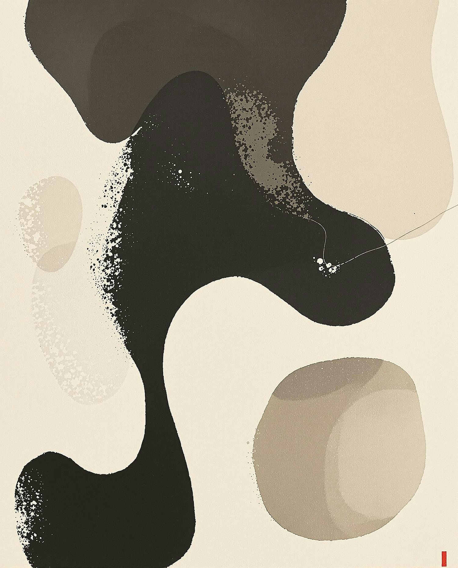 Abstract artwork with organic shapes in neutral tones and a bold red accent on a light beige background.