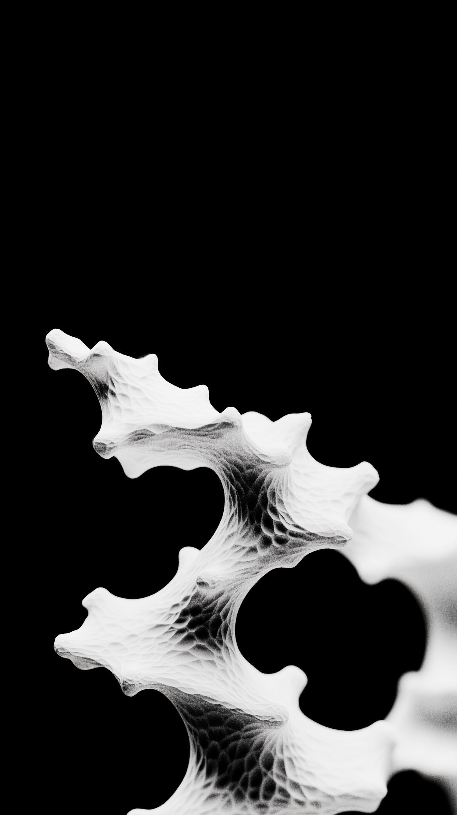 Abstract white sculpture with organic curves and textures against a black background, resembling coral or bone structure.
