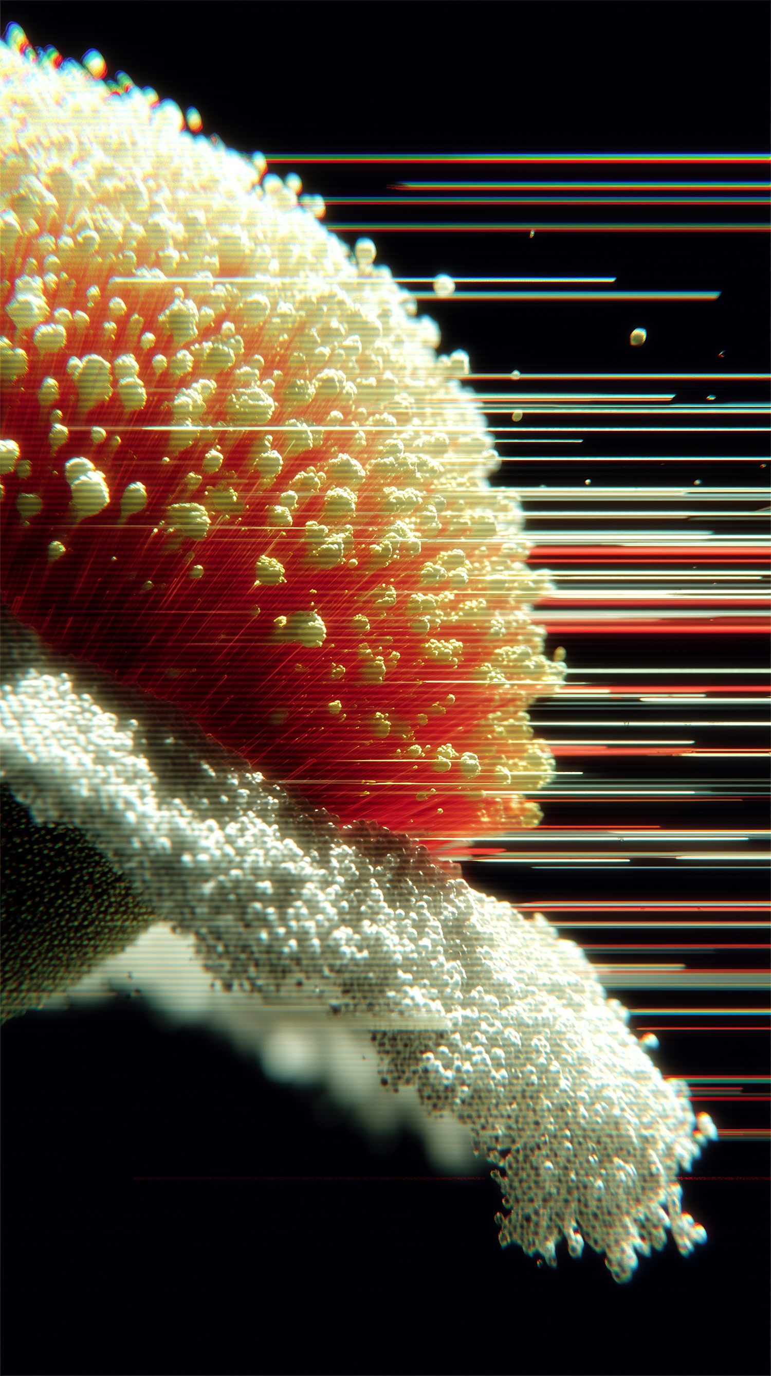 Abstract close-up of a textured, organic-like surface with vibrant colors and dynamic light streaks, creating a futuristic aesthetic.
