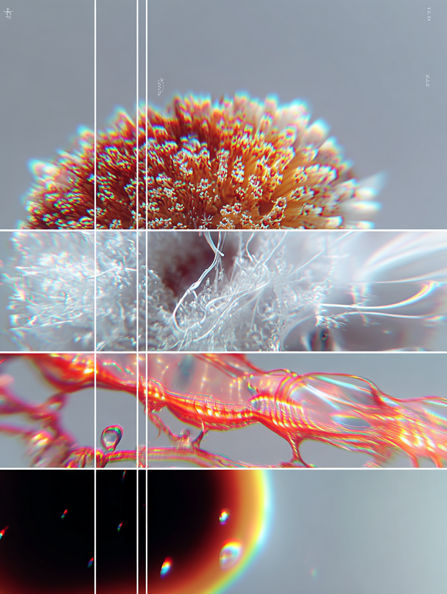 Abstract composition featuring vibrant organic textures, translucent patterns, and glowing highlights in a gradient background.