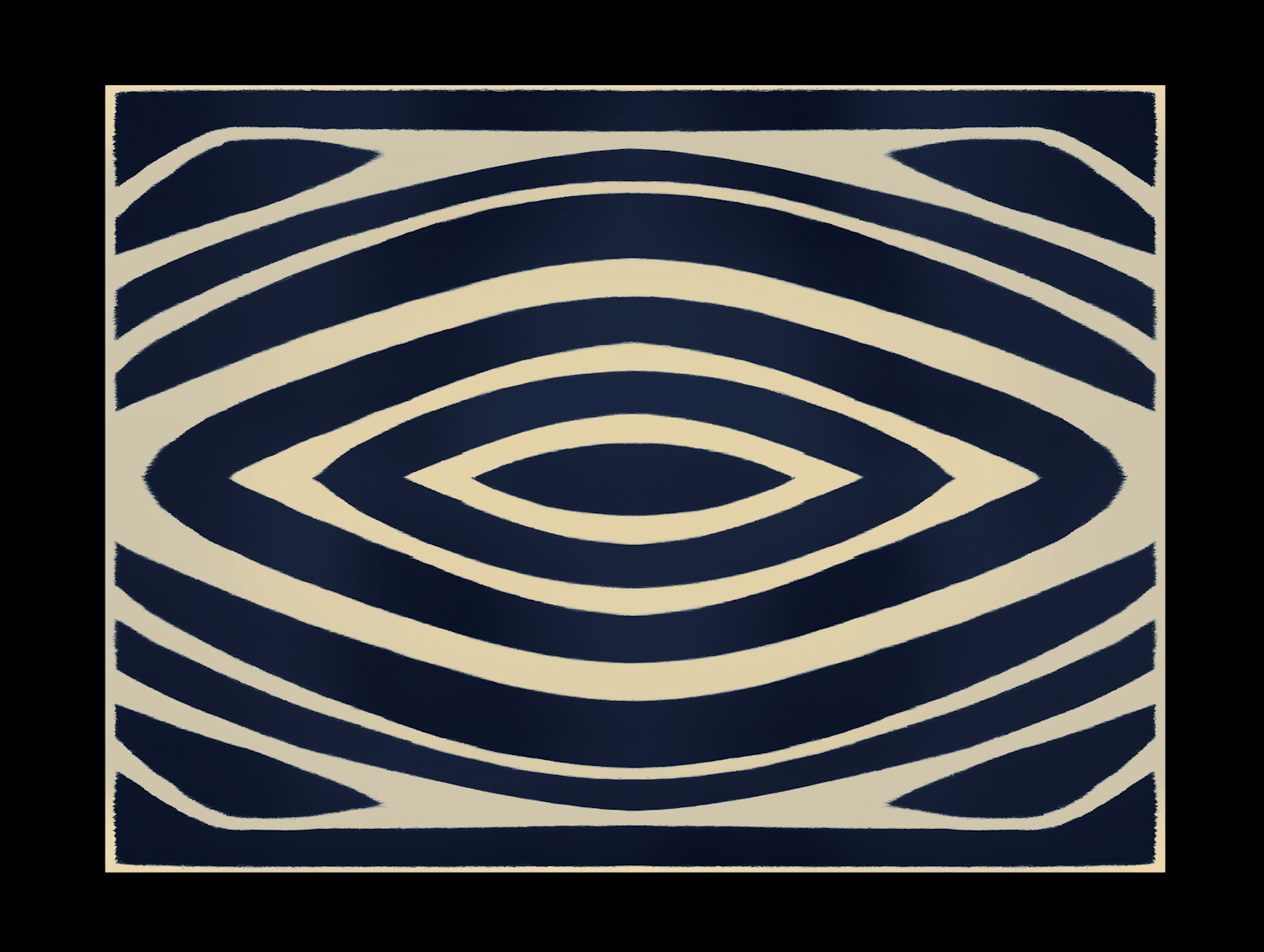 Bold abstract design with navy and cream concentric ovals on a black background, creating a hypnotic, eye-catching effect.