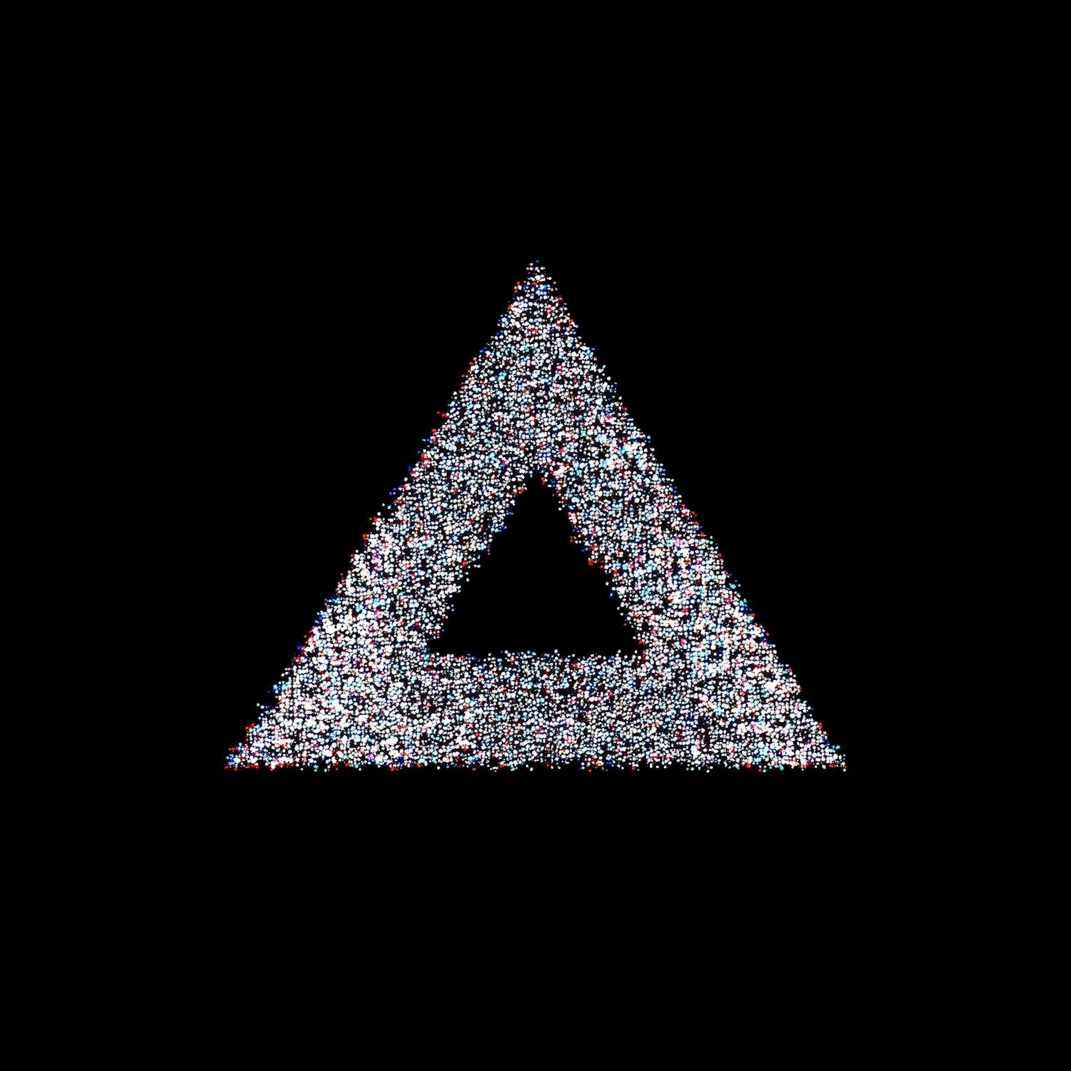 Abstract triangle made of multicolored particles on a black background, creating a vibrant and dynamic digital aesthetic.