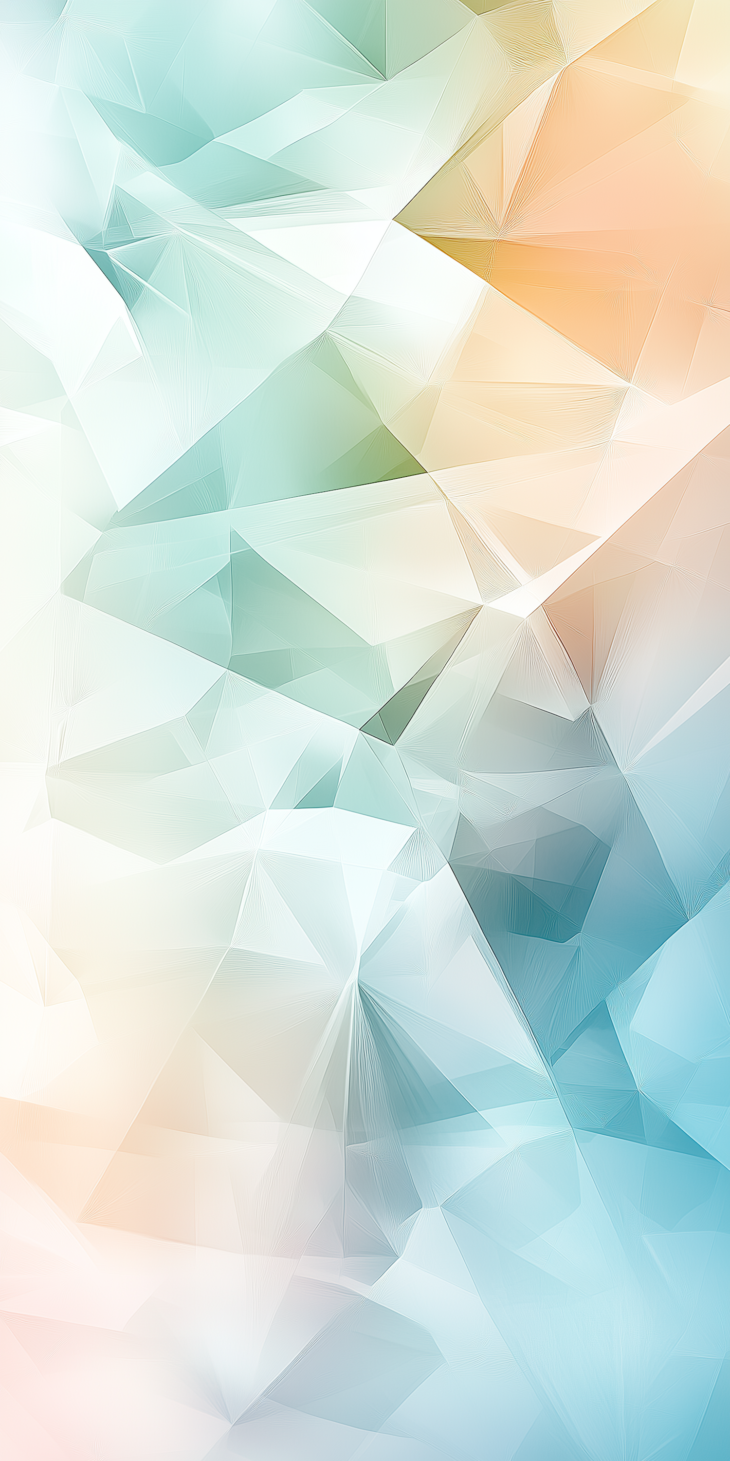 Abstract geometric design with pastel blue, green, and orange tones, featuring overlapping triangles and smooth gradient transitions.