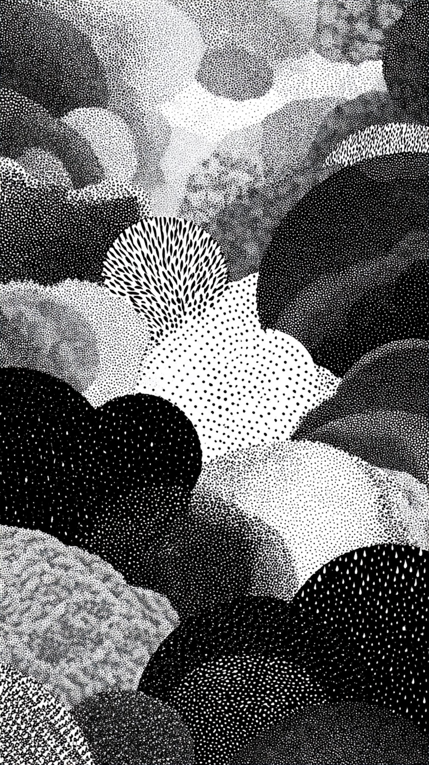 Abstract black-and-white illustration with intricate dot and line patterns forming overlapping organic shapes, creating depth and texture.