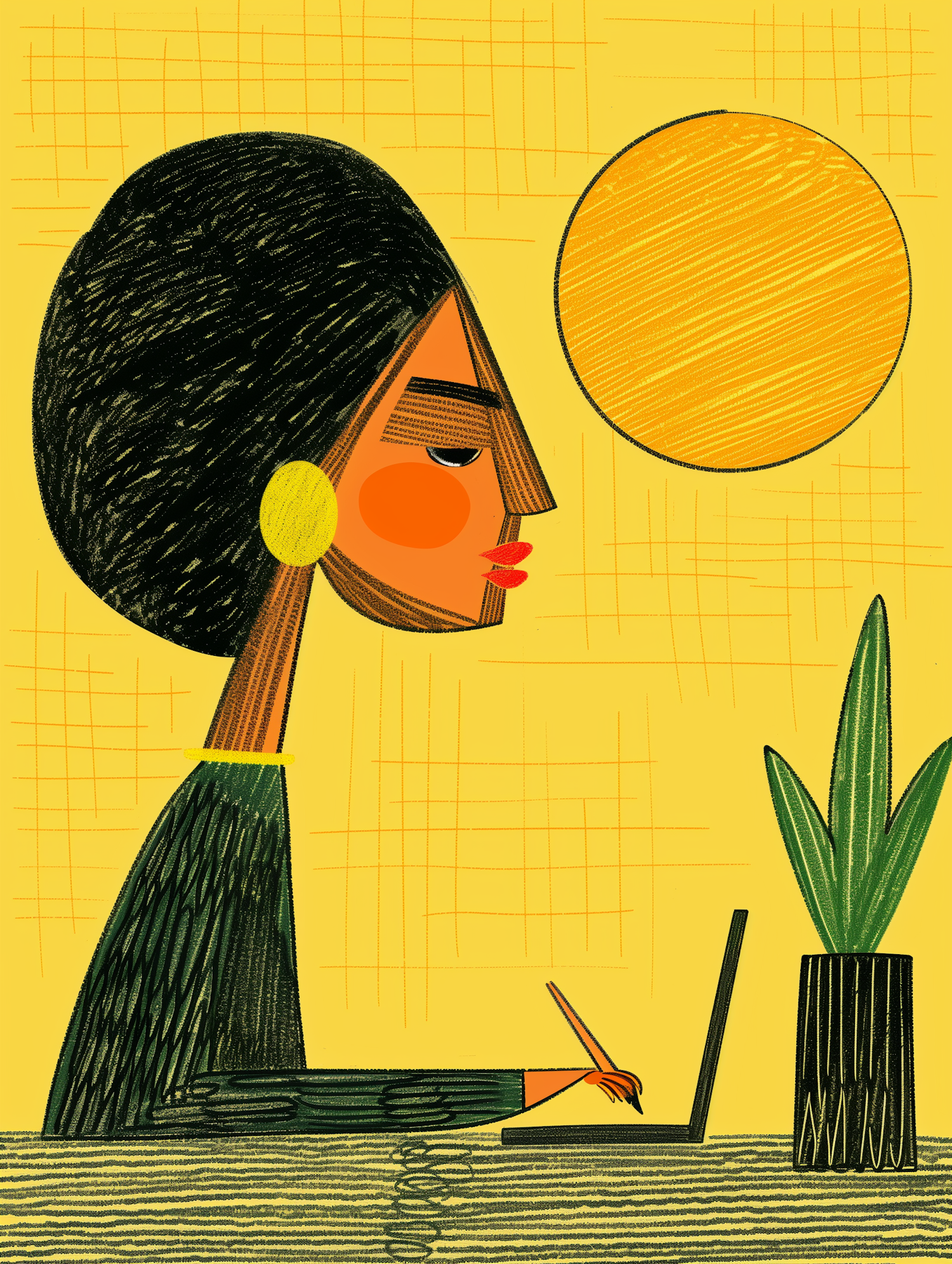 Abstract illustration of a person working on a laptop with a bright yellow background and geometric design elements.
