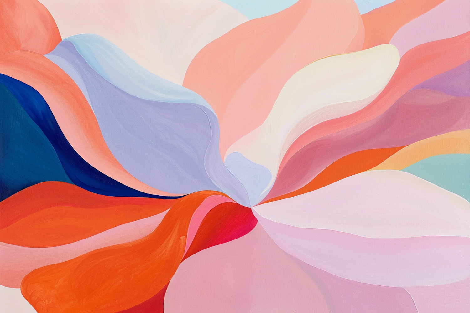 Flowing pastel tones blend in an abstract design evoking petals or waves, with vibrant accents adding depth and movement.