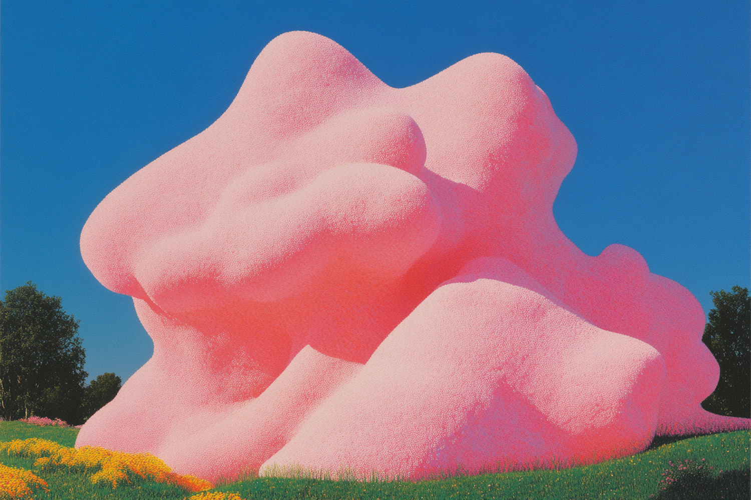 Surreal pink sculpture in a vibrant green field with yellow flowers under a clear blue sky, creating a whimsical and abstract scene.