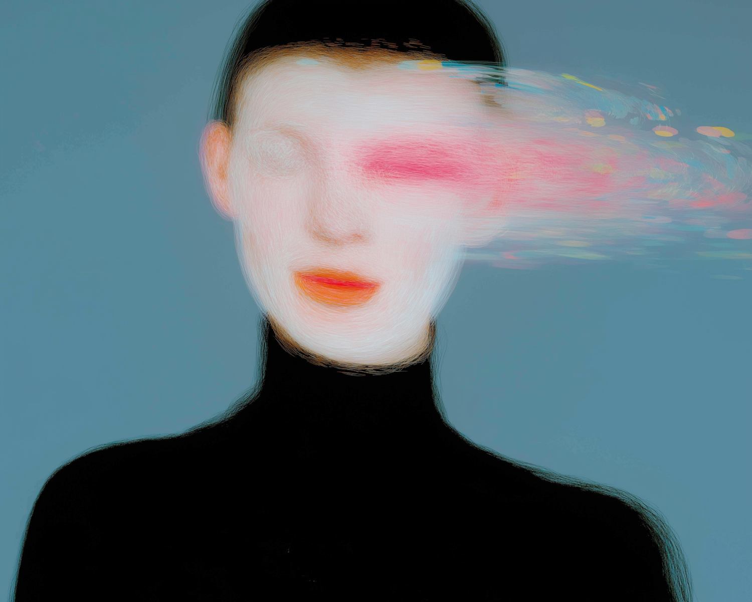 Abstract portrait with a blurred, colorful effect on a blue background, featuring a person in a black turtleneck.