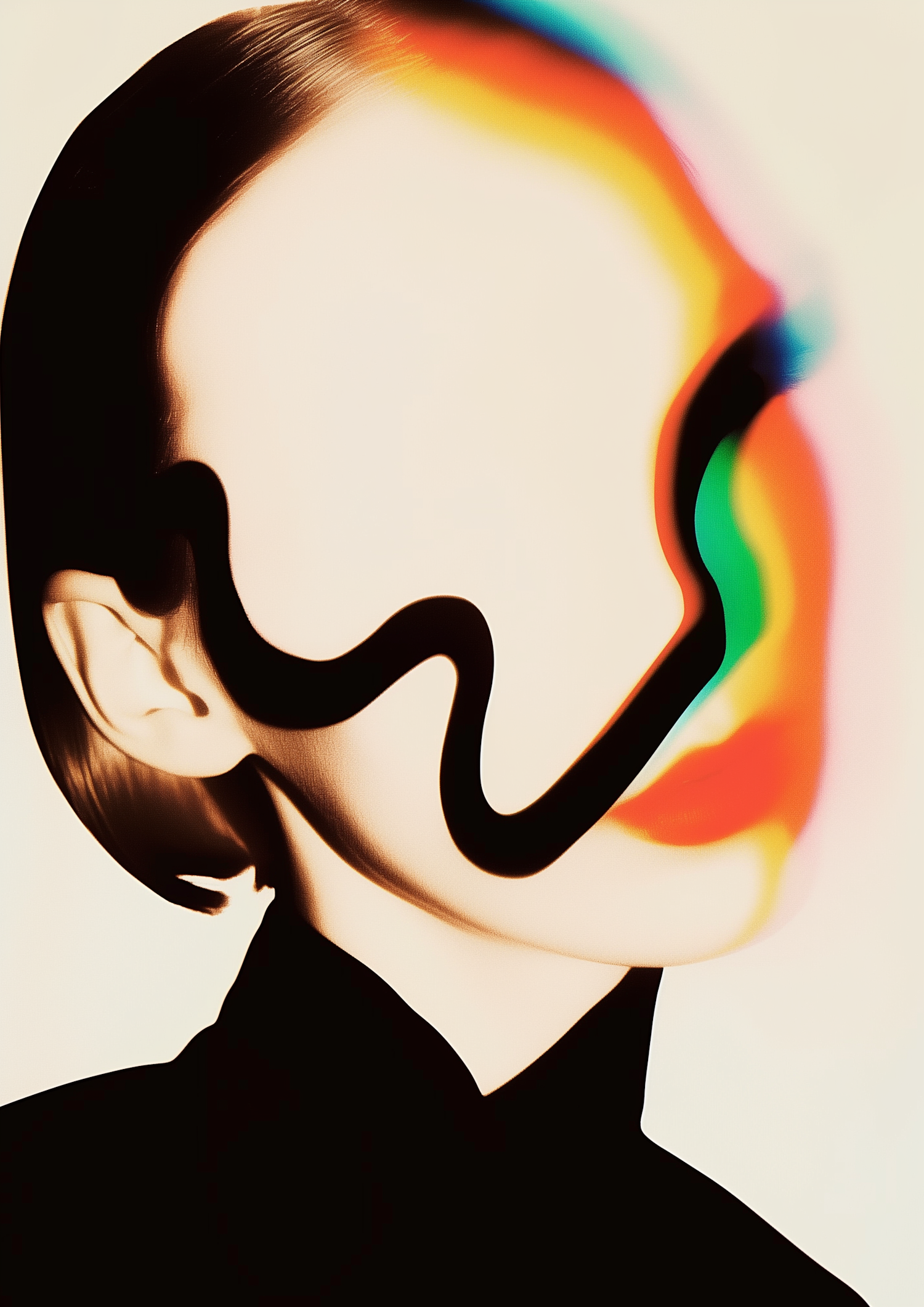 Abstract portrait with a distorted face, vibrant rainbow streaks, and sleek brown hair against a beige background. Bold and surreal art.