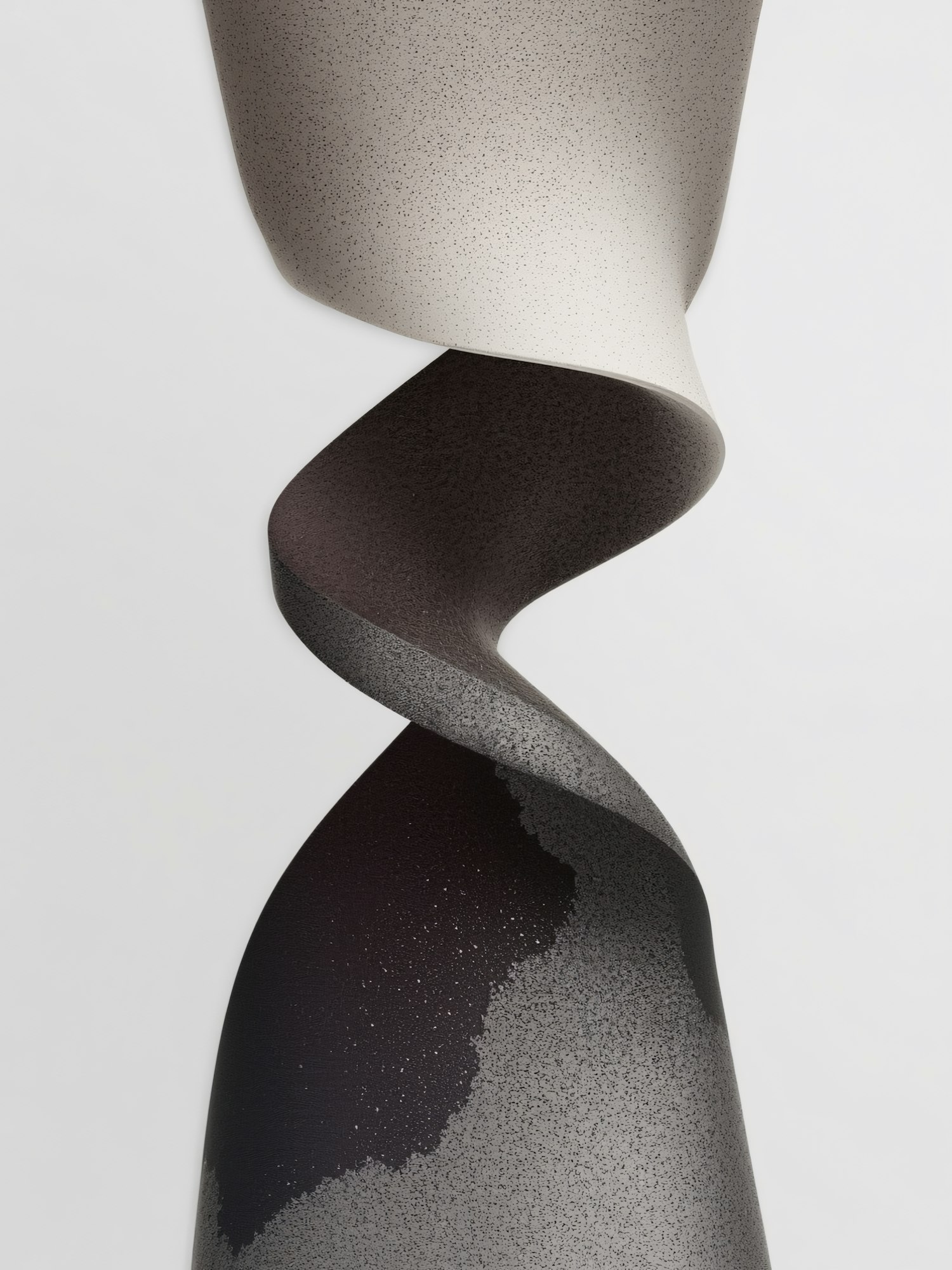 Abstract twisted sculpture with a gradient from light gray to black, featuring a speckled texture and smooth curves on a white background.