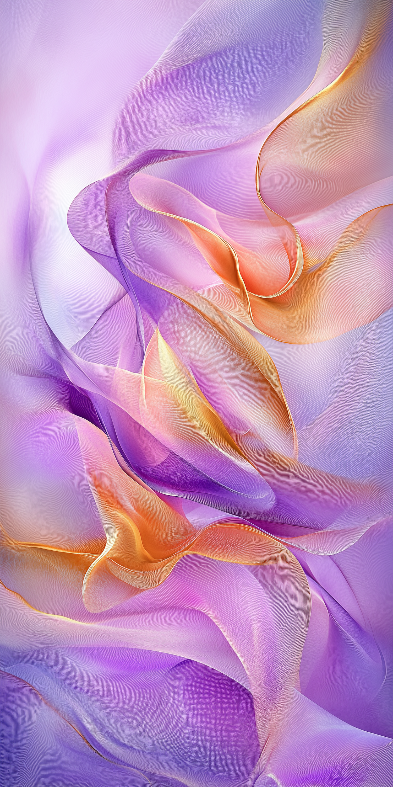 Abstract art with flowing ribbons in purple, lavender, and orange hues, creating a dreamy and ethereal visual effect.