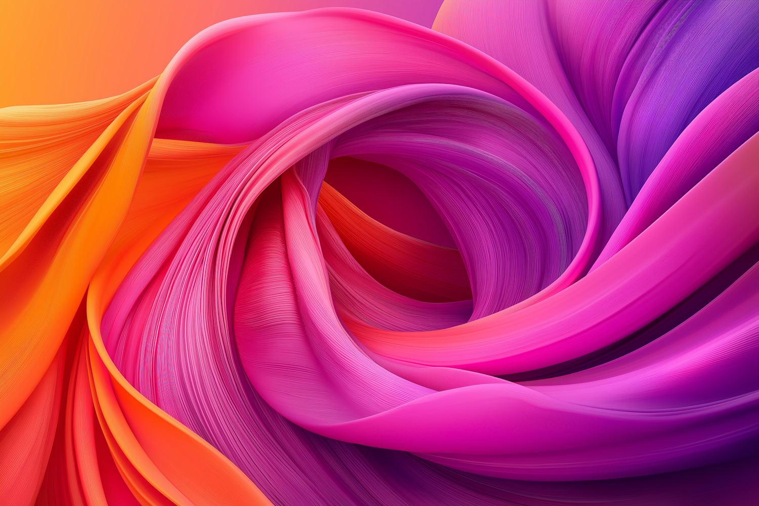 Vibrant abstract swirls of pink, purple, and orange ribbons create a dynamic and fluid motion, evoking creativity and energy.