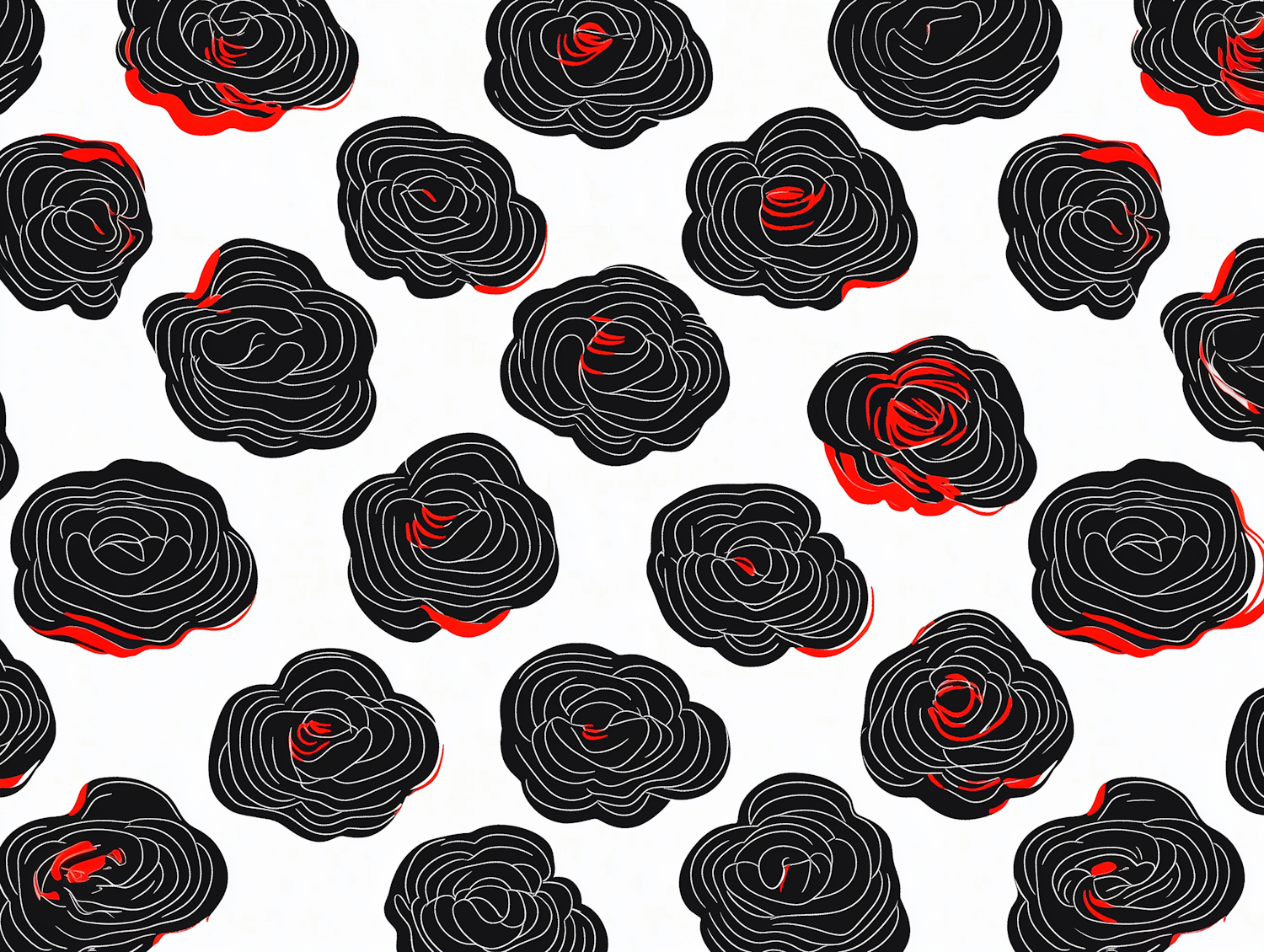 Abstract black roses with white outlines and red accents on a white background. Perfect for modern patterns or graphic design projects.