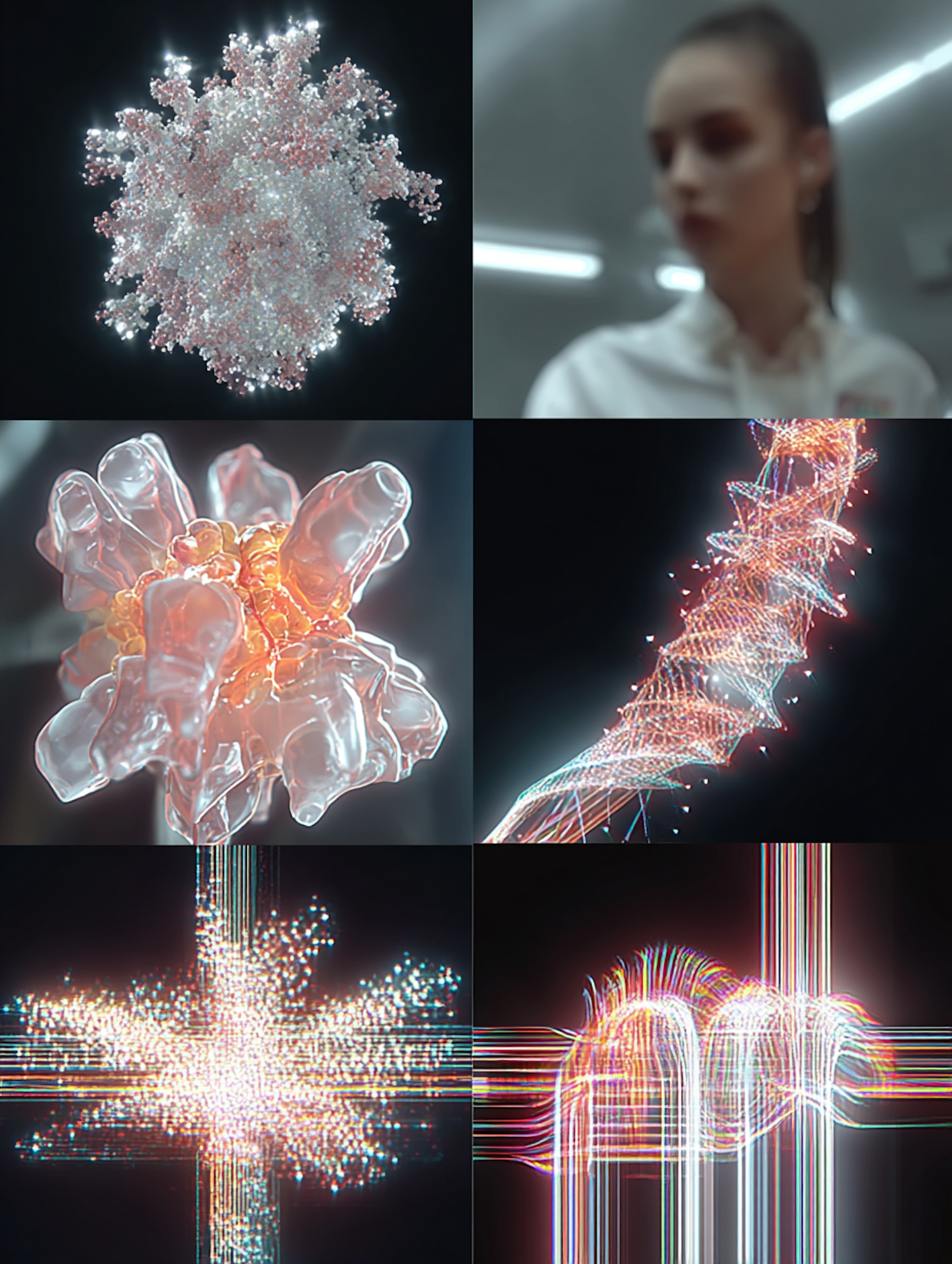 A collage of abstract and scientific visuals, including molecular structures, glowing particles, and a blurred portrait.