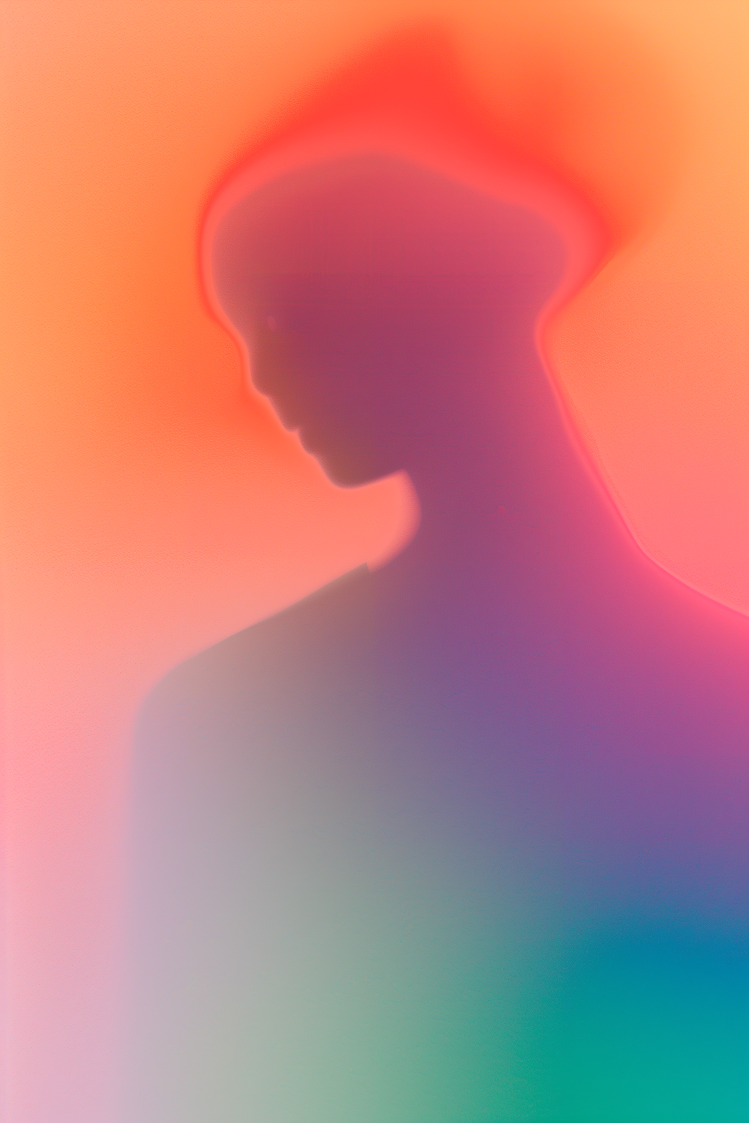 Abstract silhouette in profile with vibrant gradient hues of orange, pink, purple, and green, creating a dreamy and serene atmosphere.