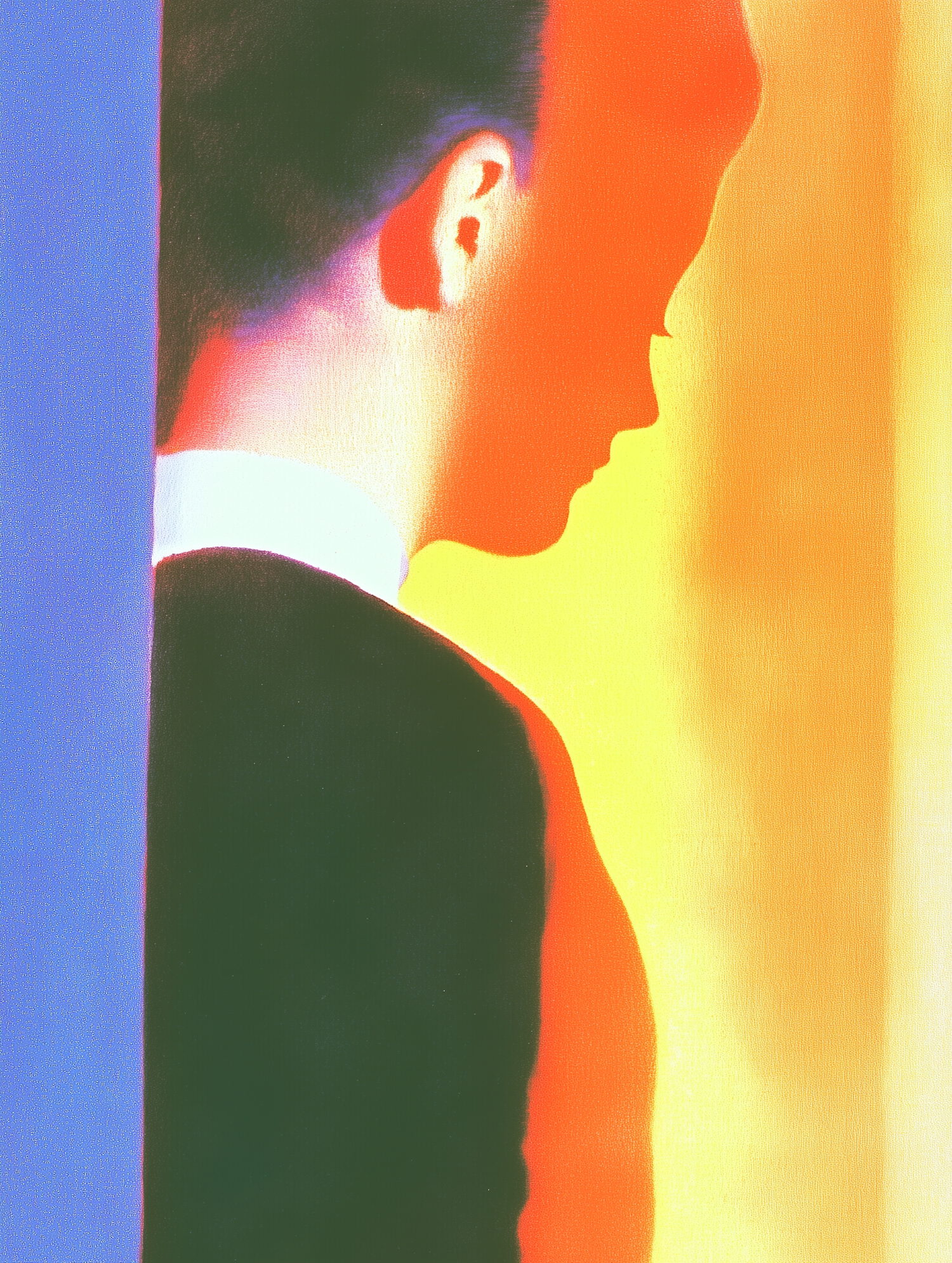 Abstract artwork of a person in profile, blending bold orange, black, blue, and yellow tones for a striking and surreal visual effect.
