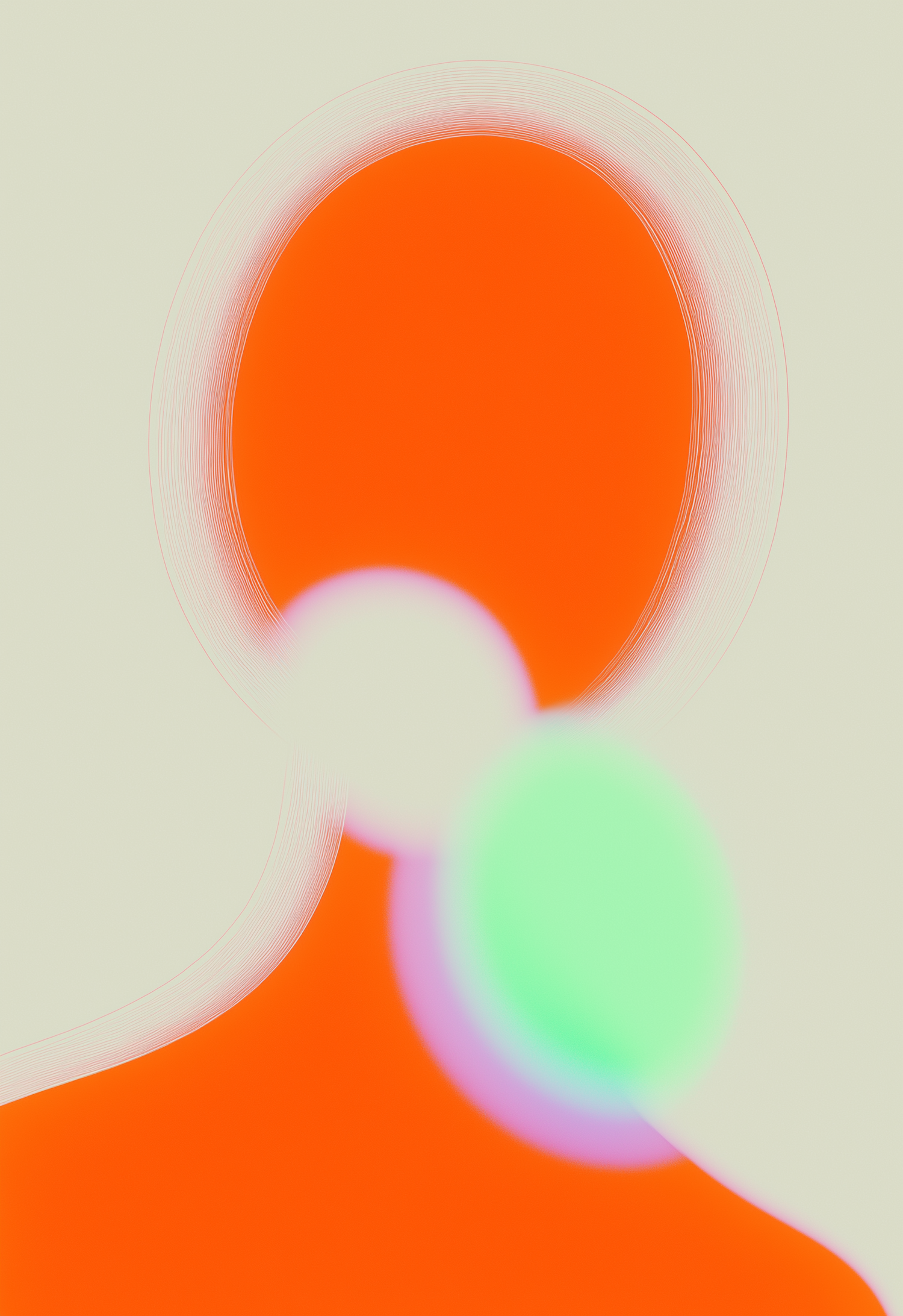 Minimalist abstract art with an orange silhouette, glowing orbs, and soft gradients on a muted beige background.