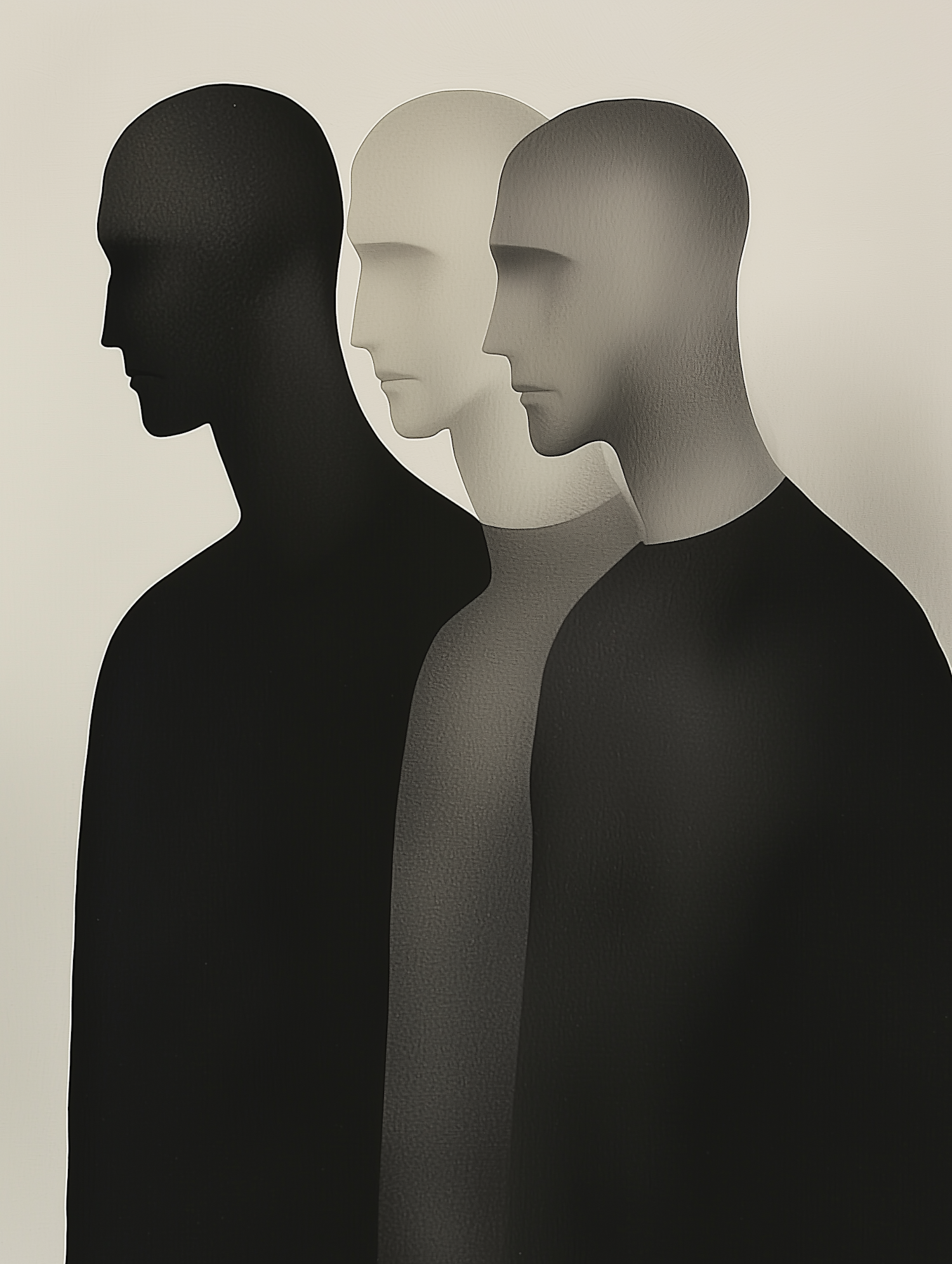 Abstract illustration of three layered human silhouettes in black, gray, and white tones, set against a neutral beige background.