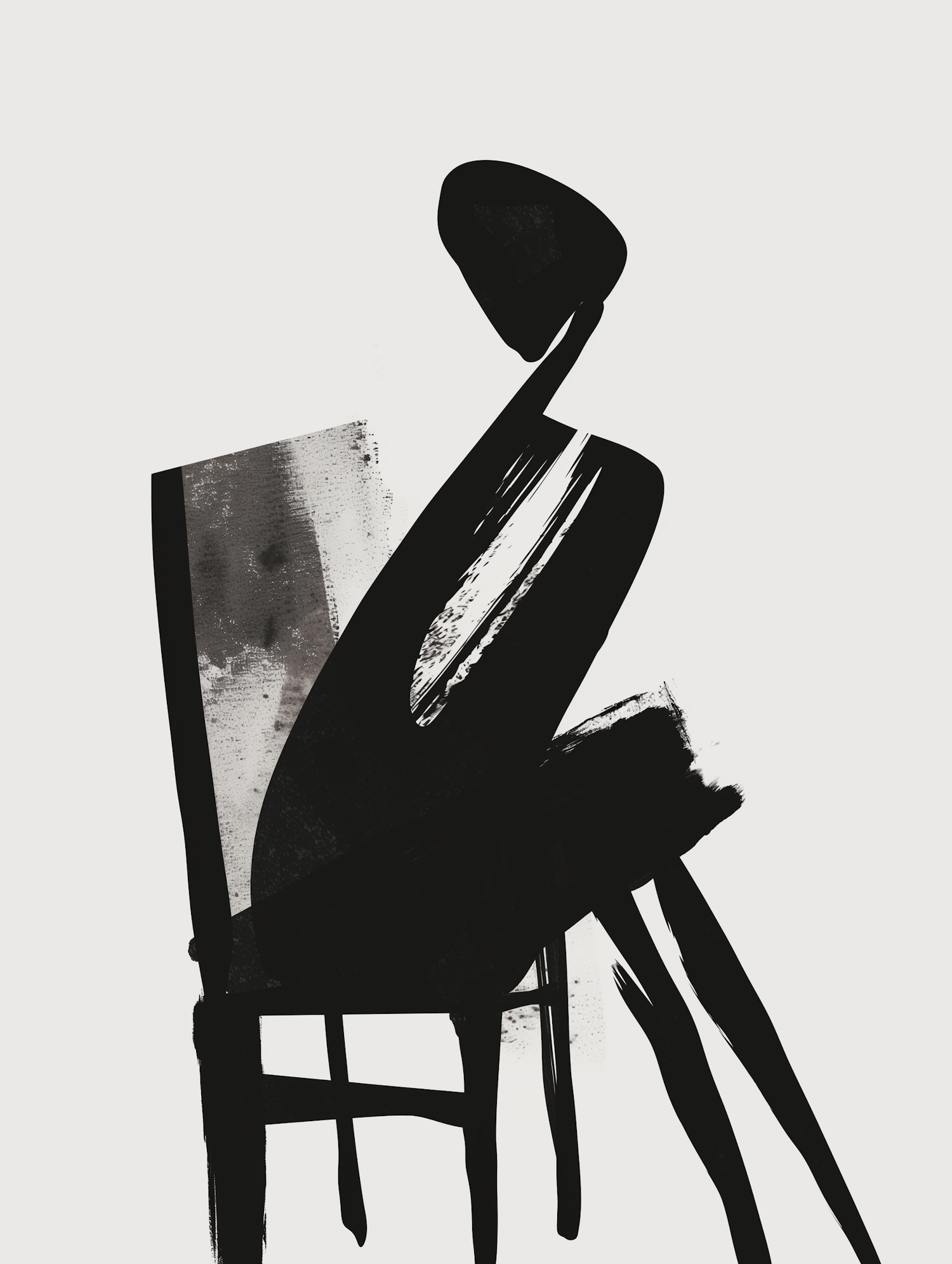 Minimalist abstract art of a human-like figure sitting on a chair, created with bold black brushstrokes on a pale background.