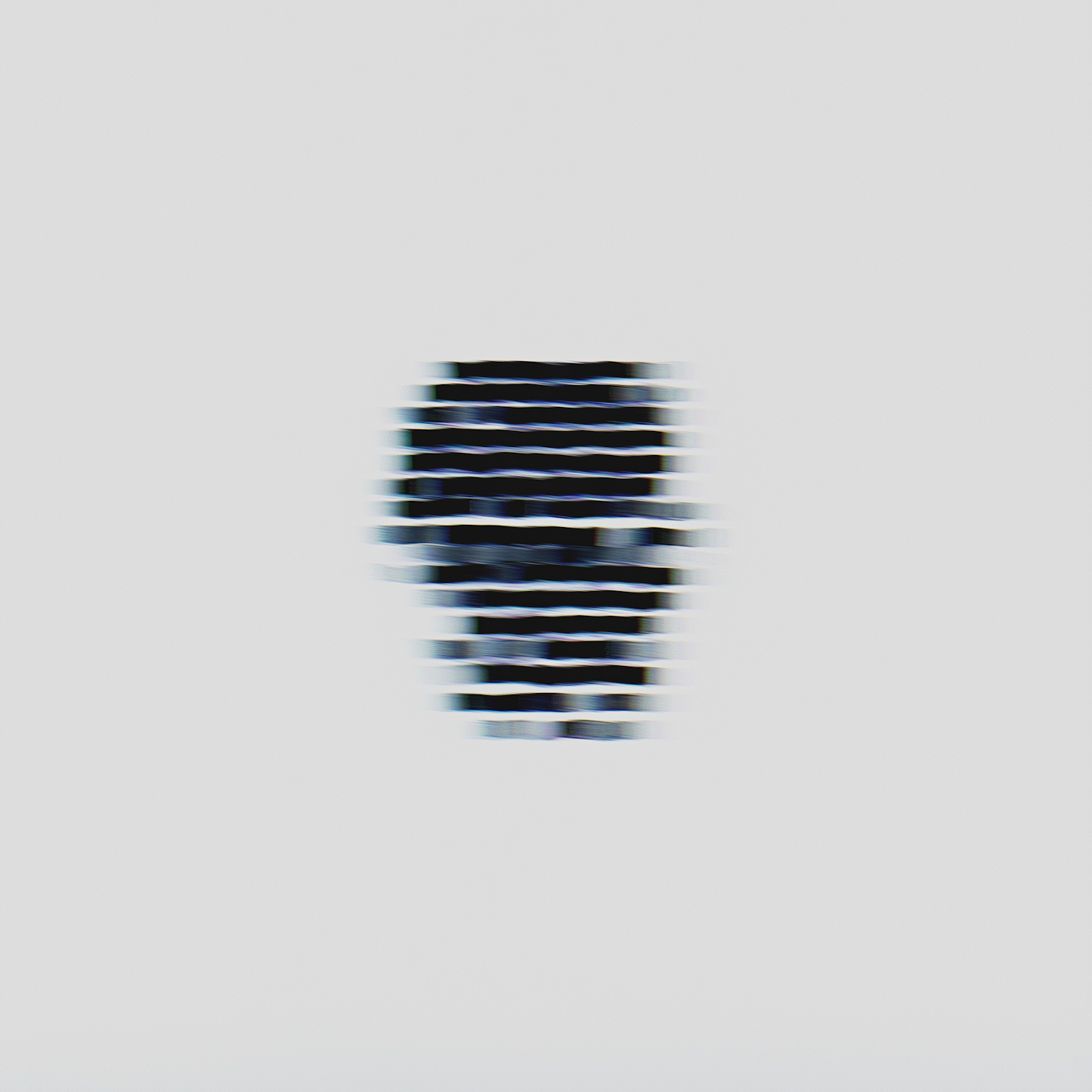Abstract blurred skull shape with horizontal lines on a light gray background, creating a minimalist and distorted effect.