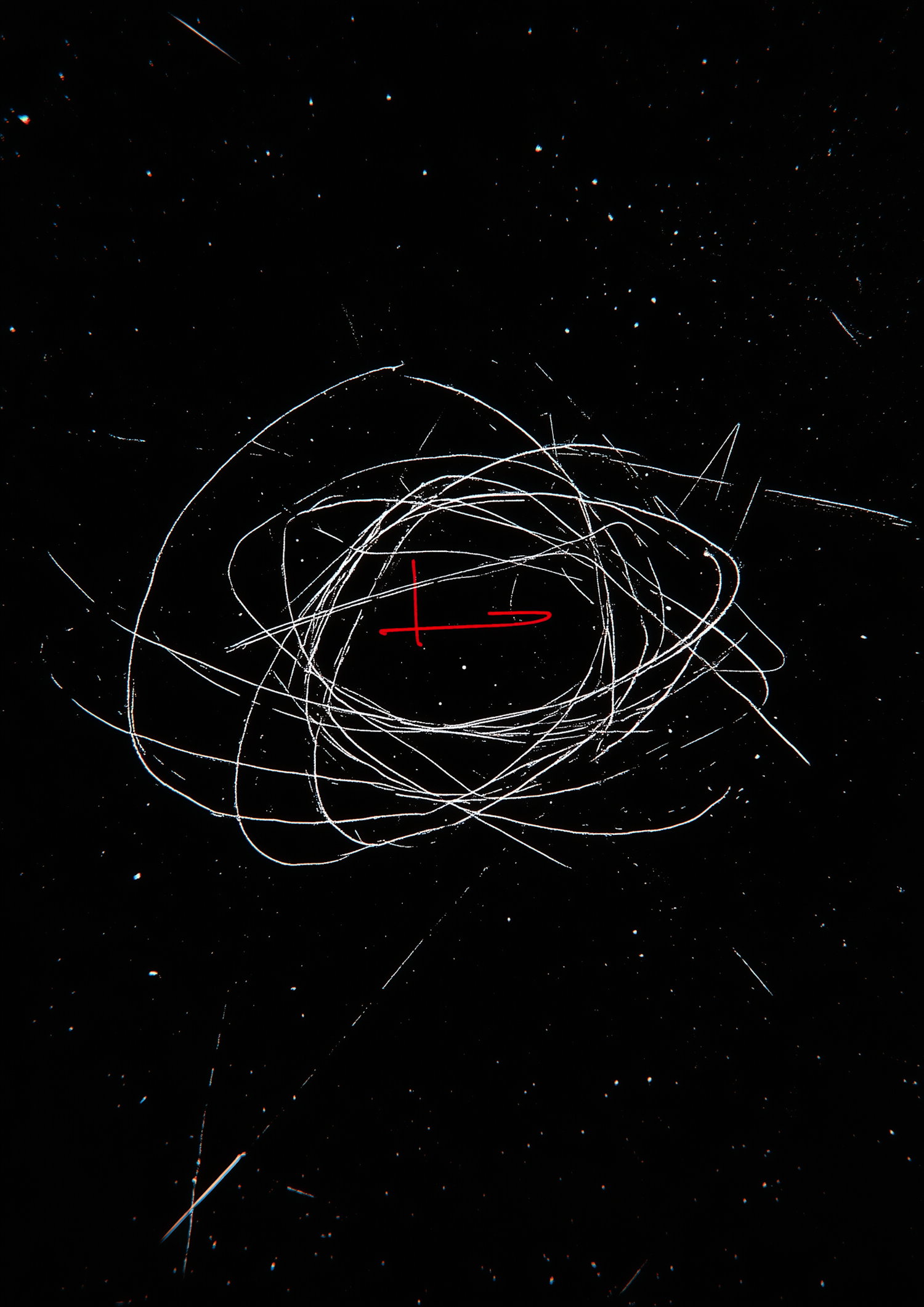 Abstract space-themed art with chaotic white lines, a red cross and arrow, and a starry black background. Dynamic and visually striking.