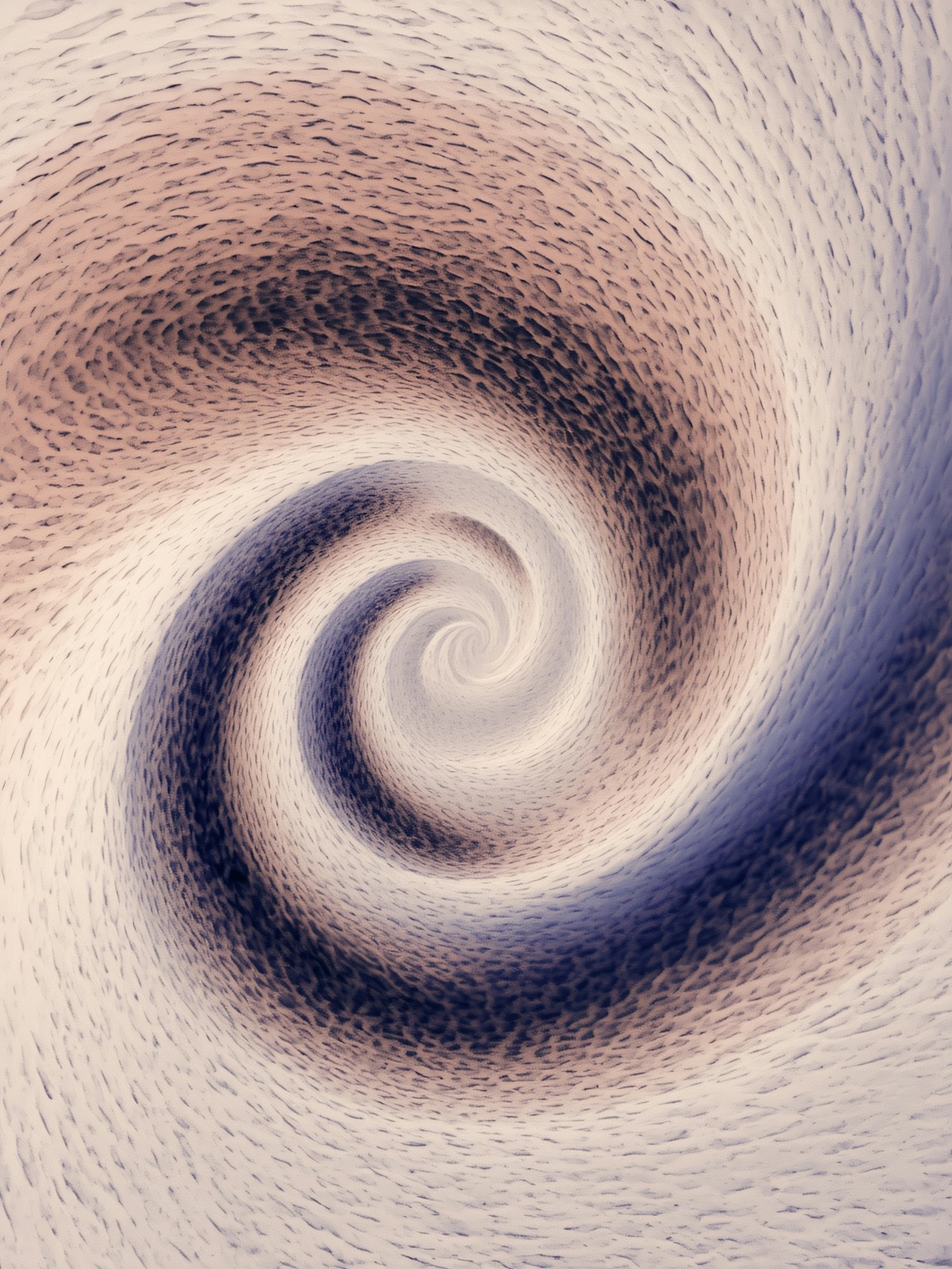 Abstract spiral pattern with beige and blue tones, featuring textured lines creating depth and motion in a dynamic composition.