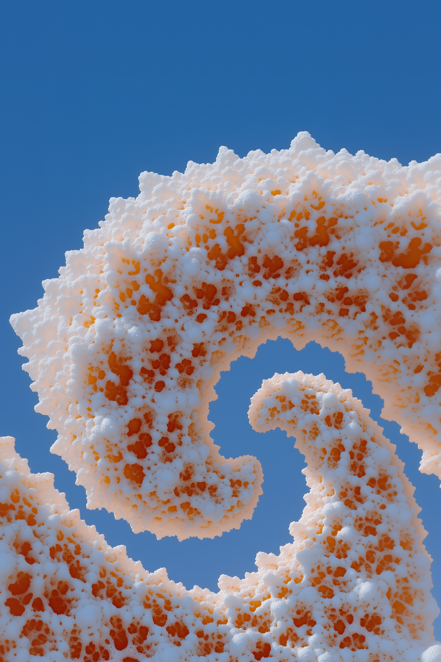 Close-up of a white and orange spiral structure with bubble-like texture against a vibrant blue sky, resembling coral or foam.