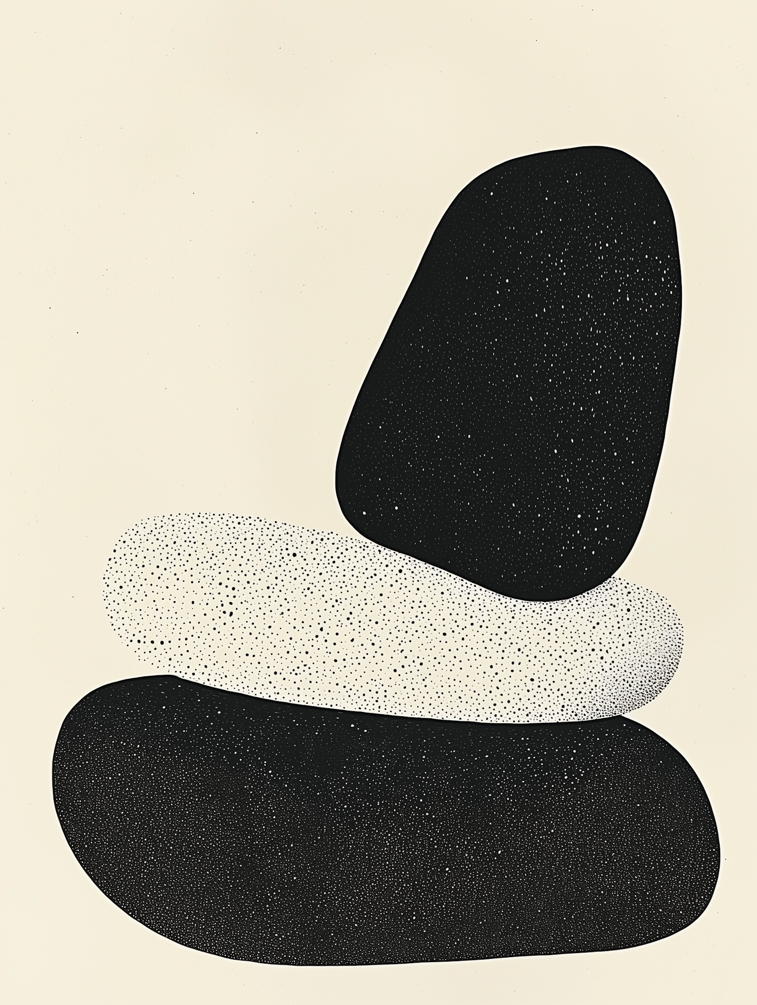 Minimalist illustration of stacked abstract shapes in black and white on a beige background, creating a balanced and harmonious composition.