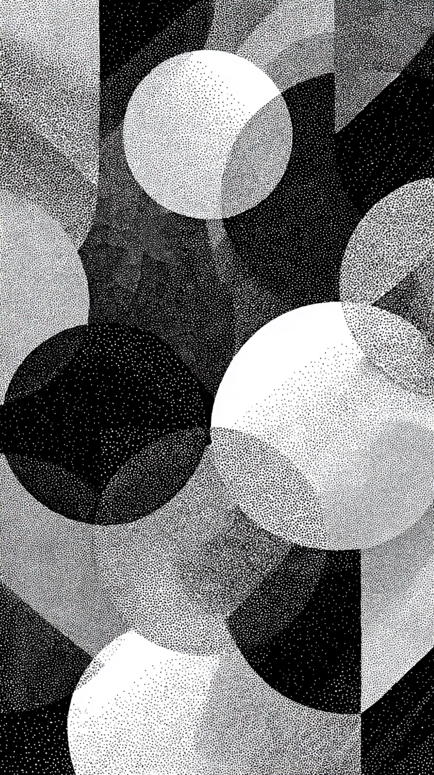Abstract black-and-white stippled artwork with overlapping circles and geometric shapes, creating a dynamic and textured composition.
