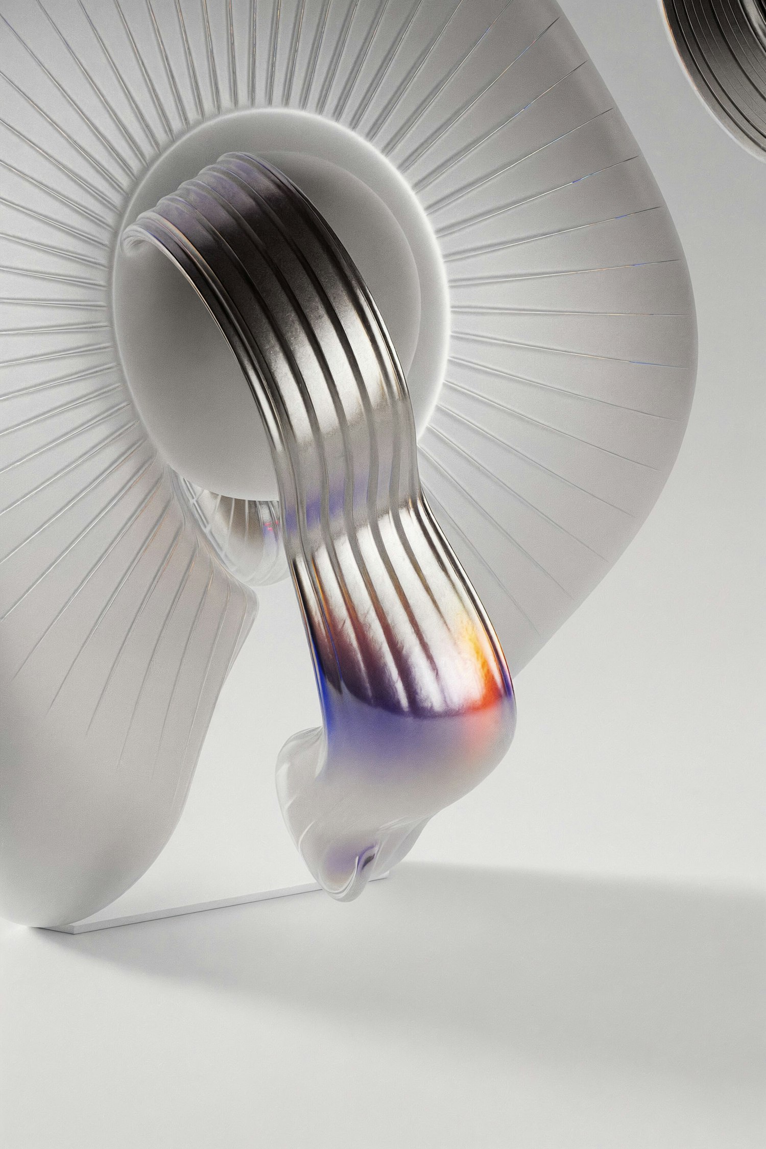Abstract sculpture with metallic and translucent elements, featuring a gradient of colors and intricate textures in a minimalistic setting.