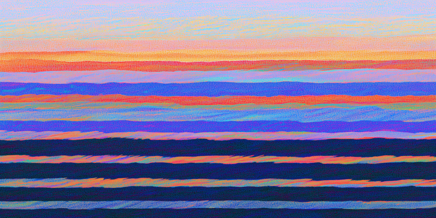 Vibrant abstract painting with horizontal bands of pastel and deep colors, evoking a serene sunrise or sunset.
