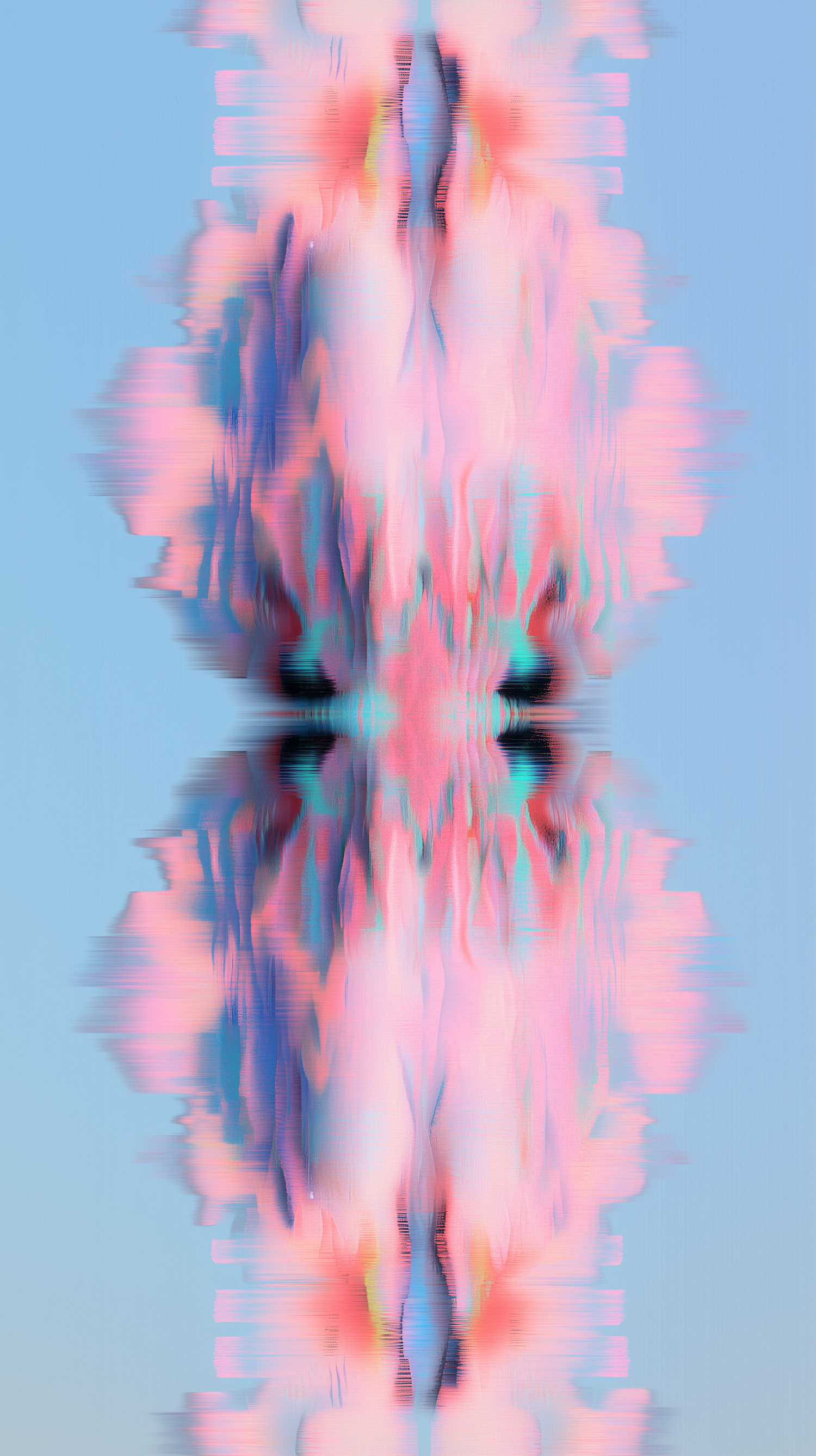 Abstract symmetrical pattern with pastel pinks, blues, and purples on a light blue background, creating a digital glitch effect.