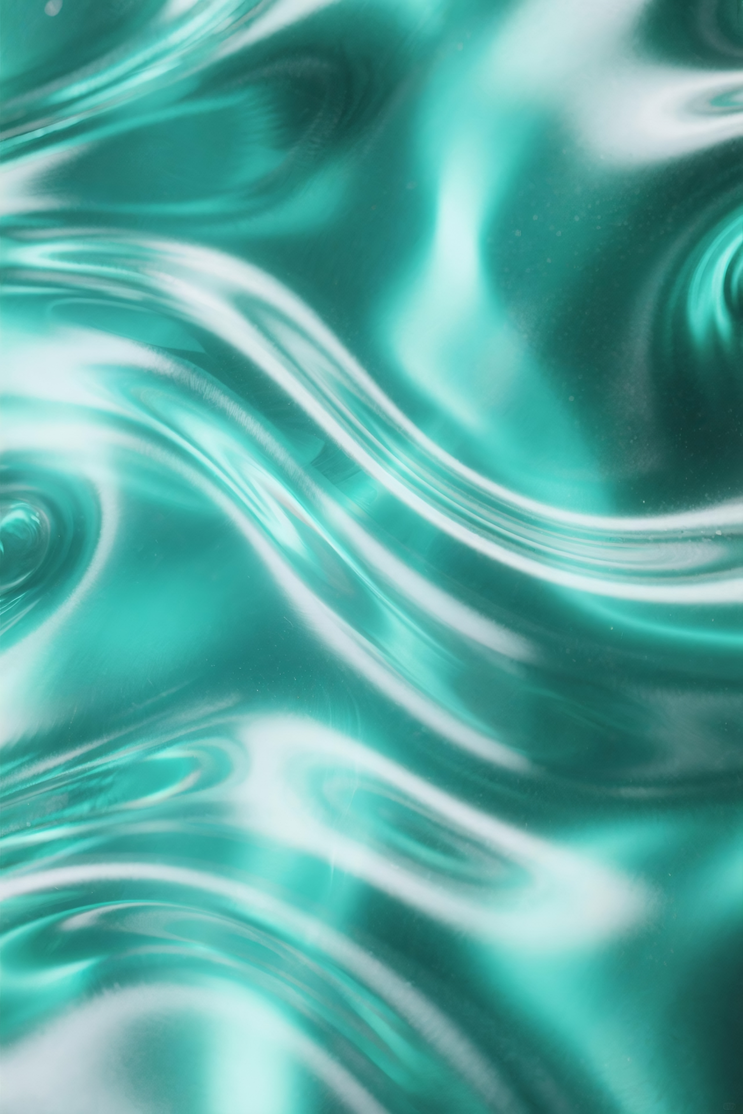 Abstract teal and white wavy patterns resembling liquid or glass, creating a dynamic and soothing visual effect.