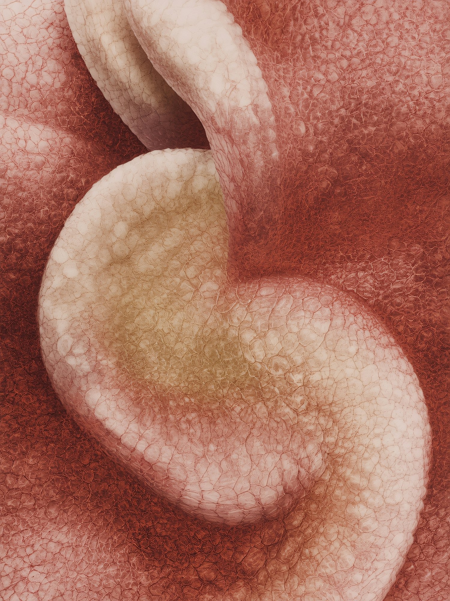 Abstract close-up of textured, flowing shapes in red and cream tones, with a cracked pattern and organic contours.