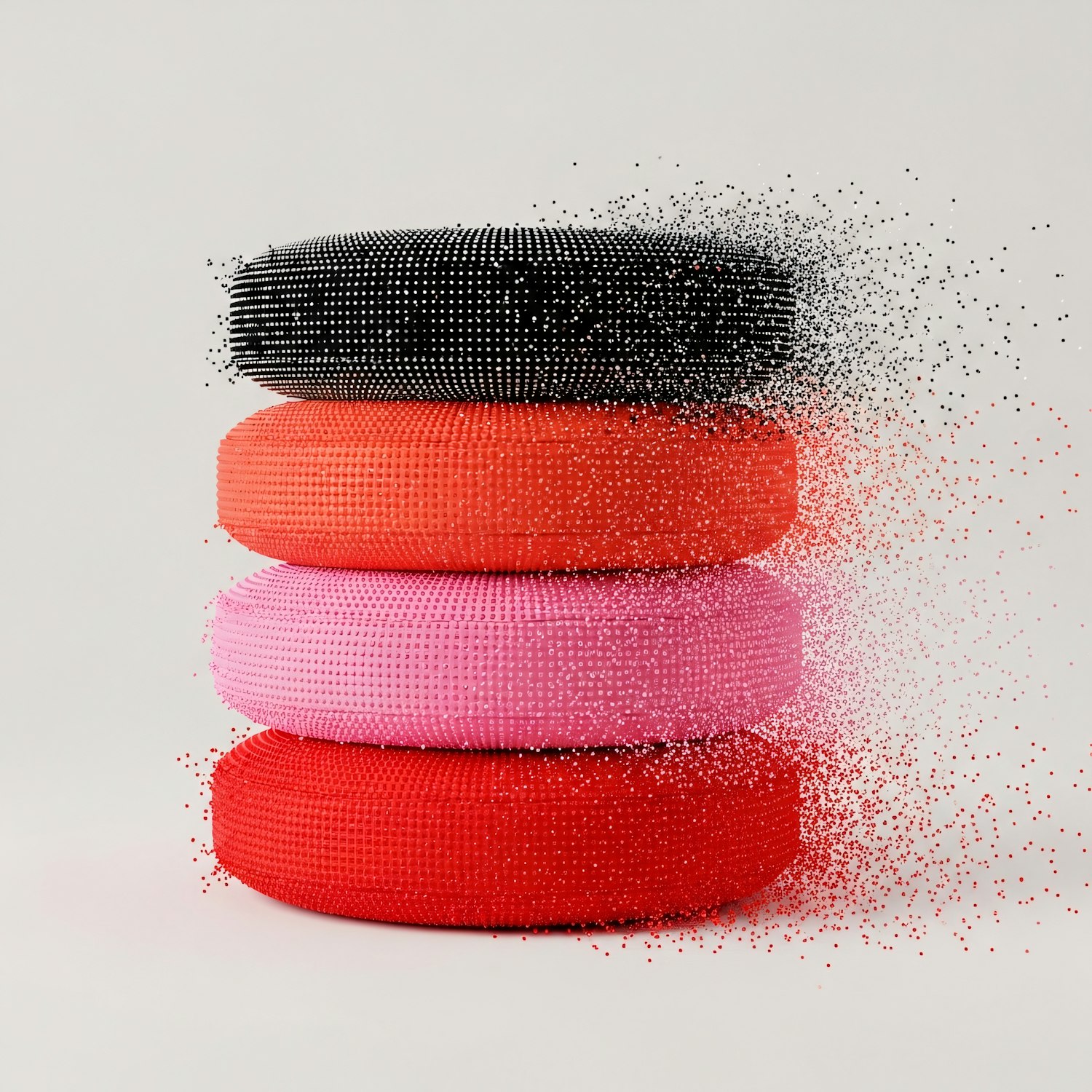 A stack of colorful, textured circular objects disintegrating into dots, creating a dynamic and abstract visual effect.
