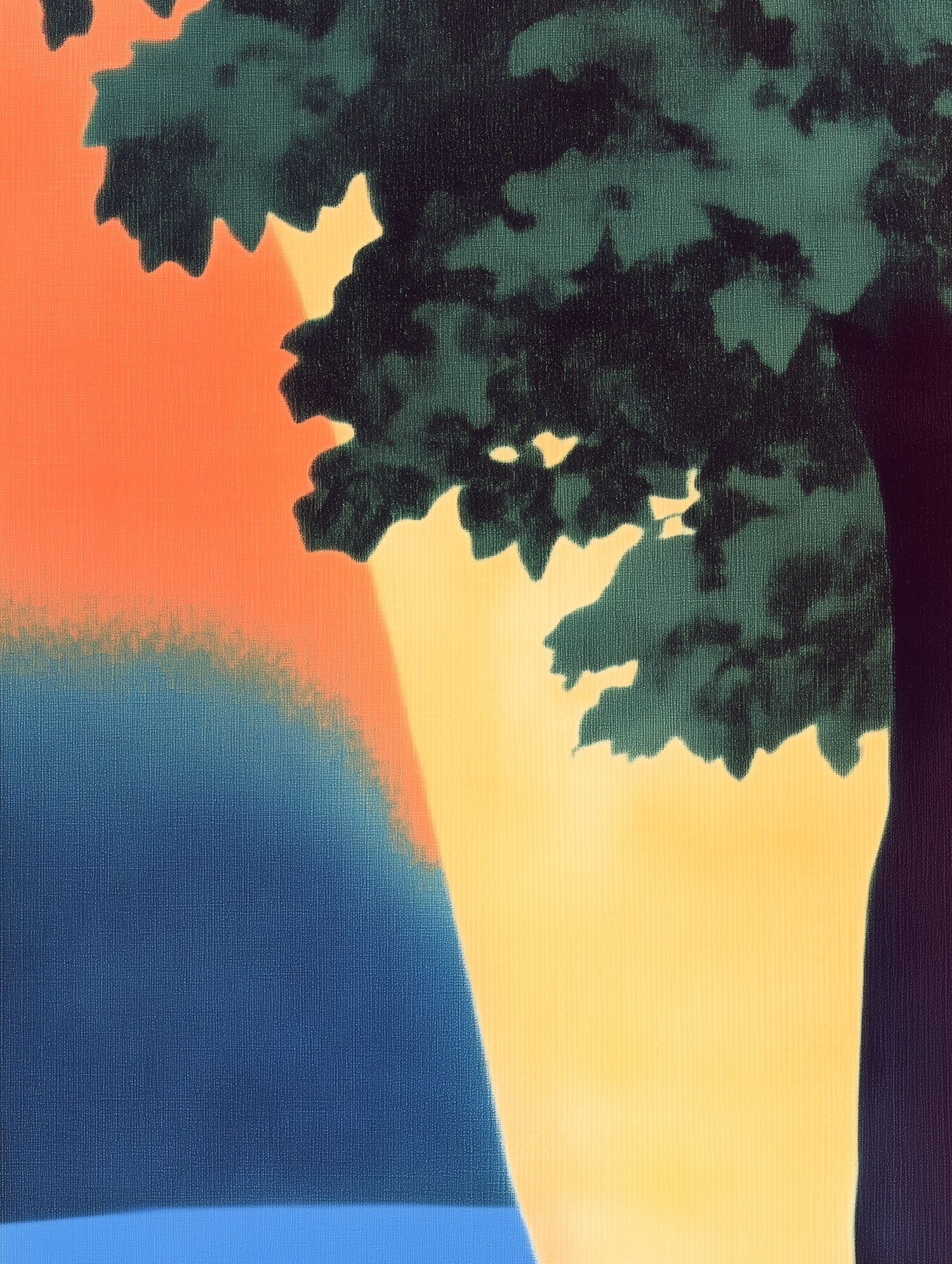 Abstract painting of a tree with dark green leaves against a glowing gradient background of blue, yellow, and orange hues.