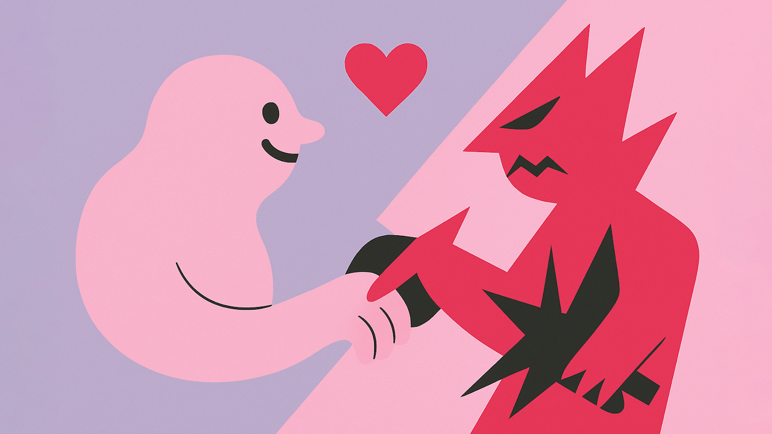 Abstract art of a pink figure shaking hands with a red spiky figure, with a heart above them, symbolizing unity and contrast.