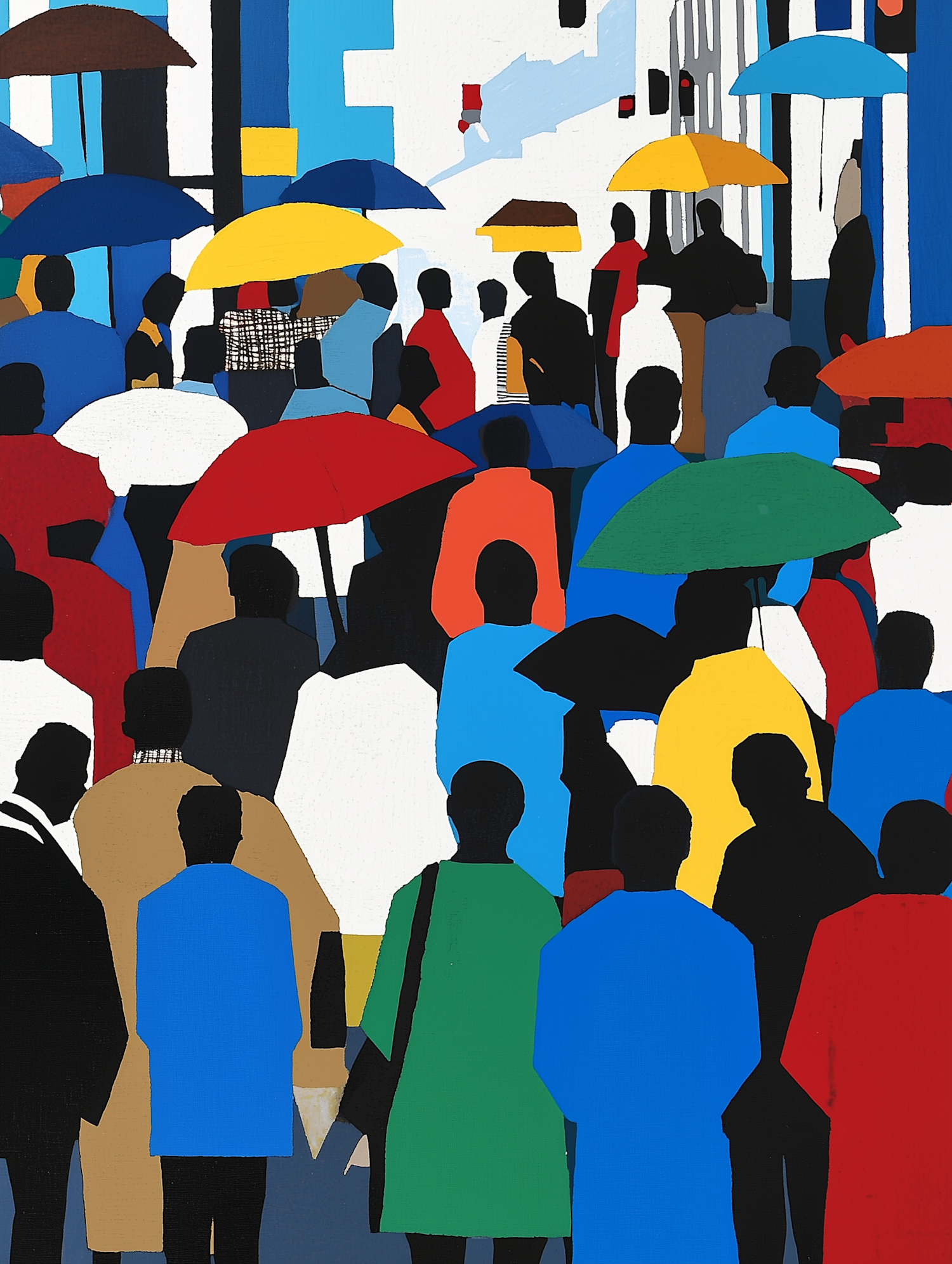 Abstract urban crowd scene with colorful umbrellas and minimalist figures in vibrant hues, set against a simplified city backdrop.