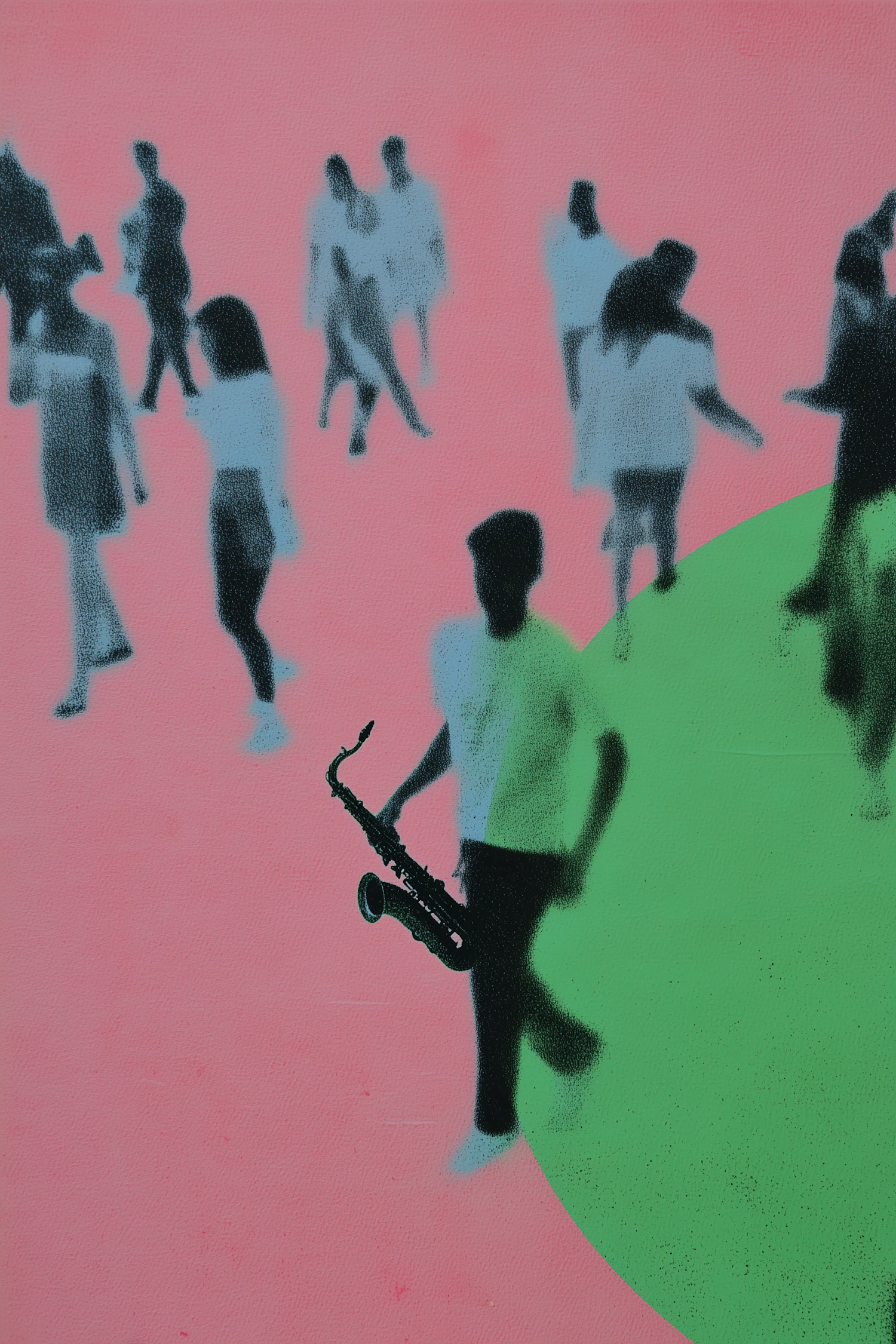 Abstract artwork of people walking on a pink background, with one figure holding a saxophone and a green circular accent.