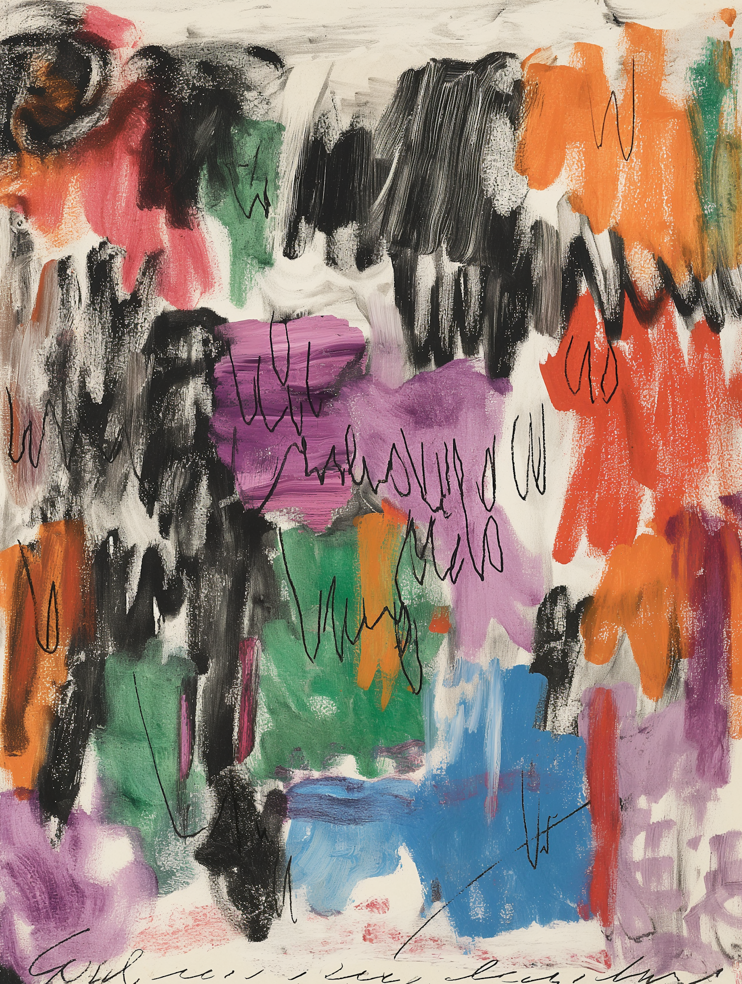 Vibrant abstract painting with bold brushstrokes in black, orange, green, purple, and blue, featuring dynamic scribbles.