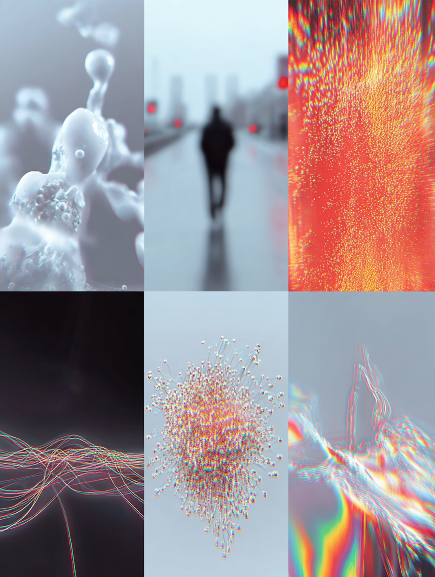 A collage of abstract visuals, including a foggy street, colorful patterns, and artistic textures, showcasing diverse creative styles.