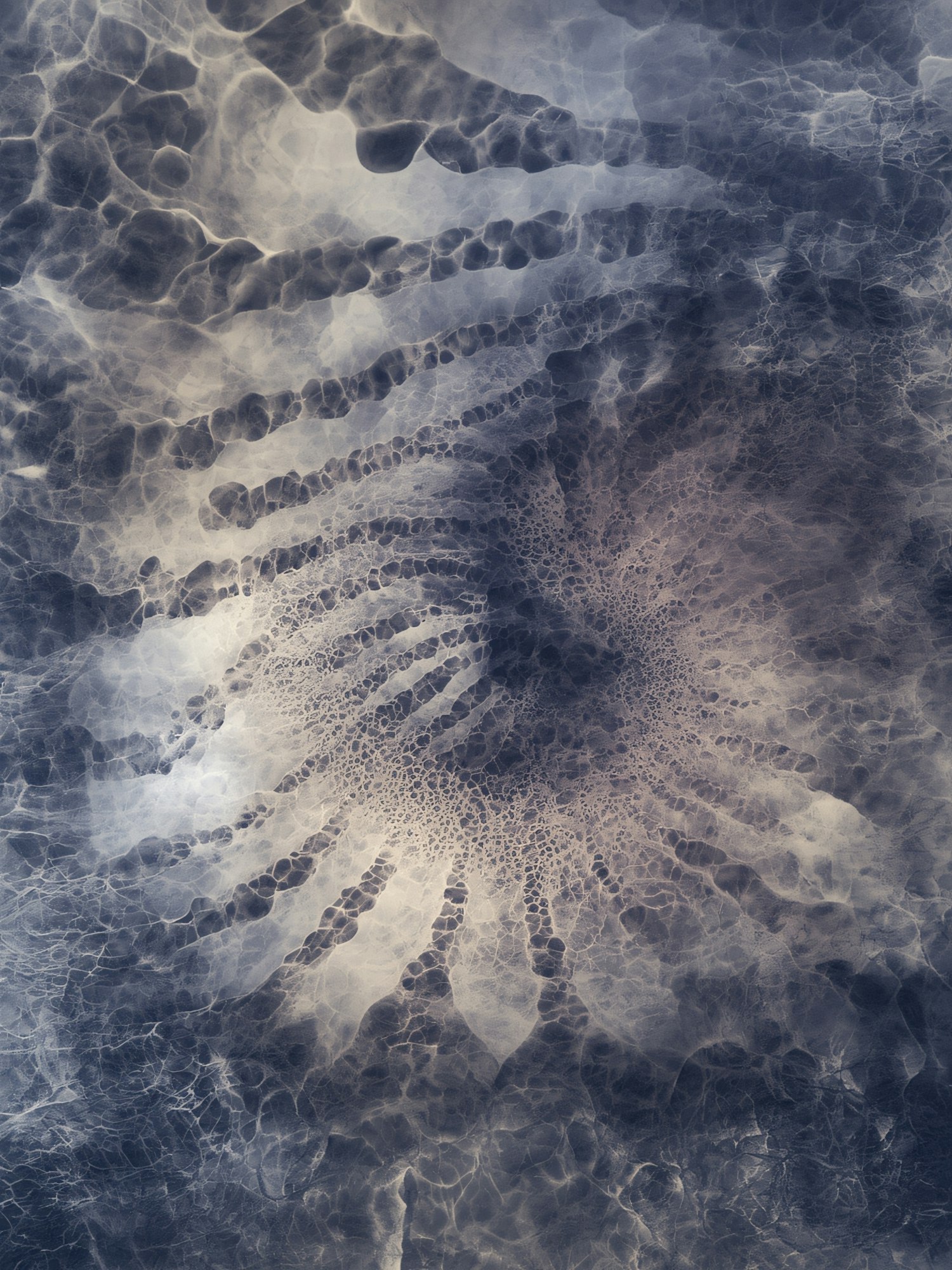 Abstract pattern with radial and ripple-like textures in shades of blue and gray, evoking a sense of fluidity and natural movement.