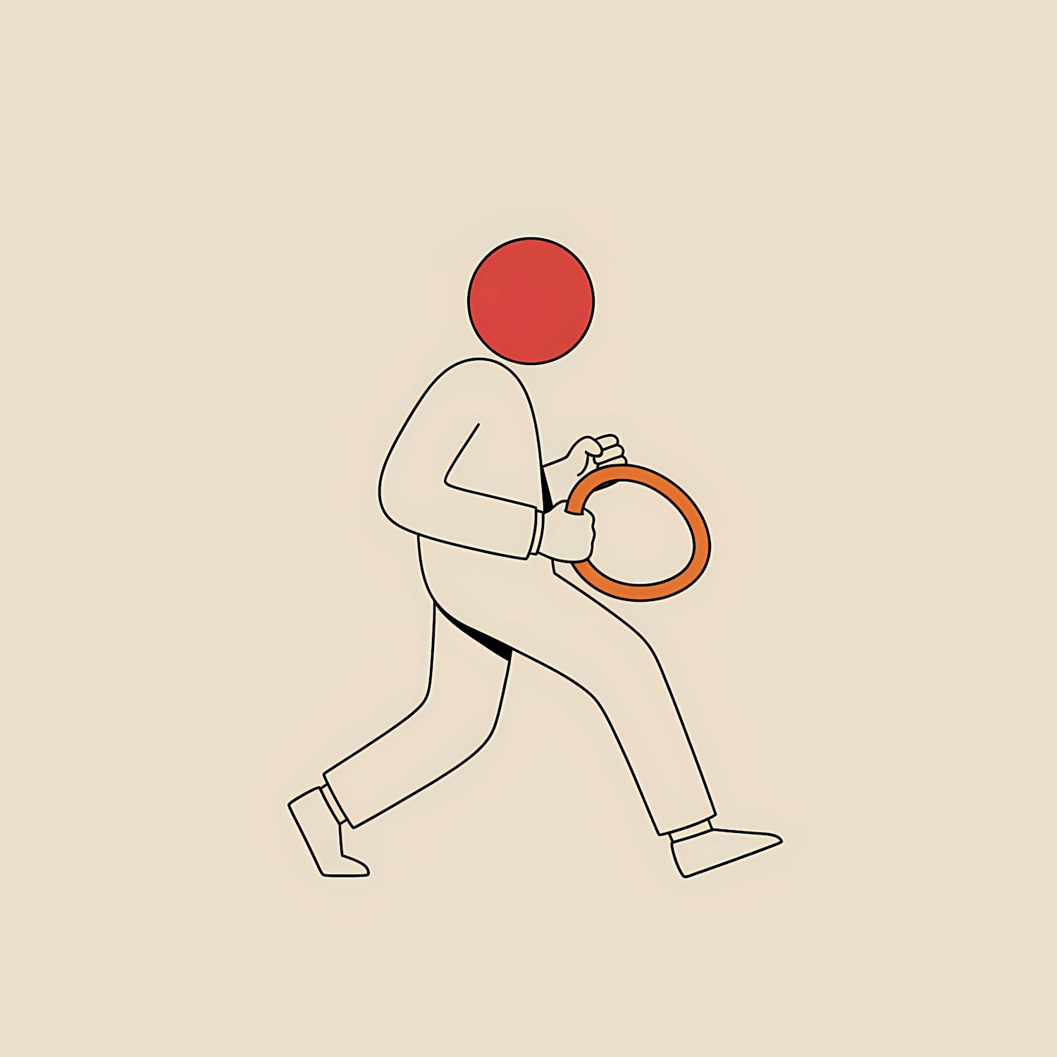 Minimalist illustration of a figure with a red head holding an orange ring, set against a beige background.