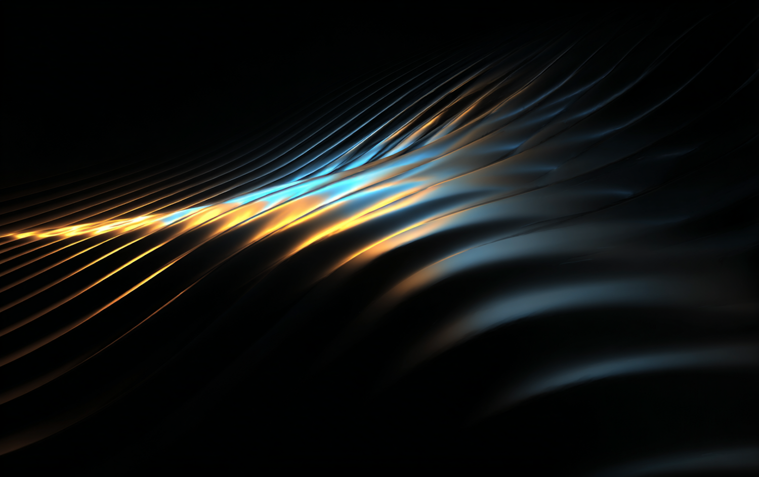 Abstract digital art with flowing wave-like structures in golden and blue tones against a dark background, creating a sleek and dynamic effect.