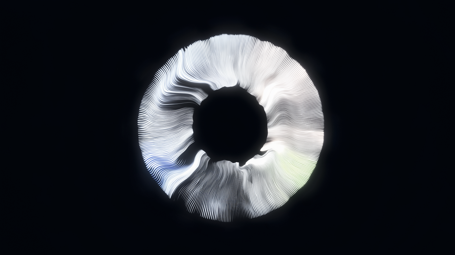 Abstract circular wave design with glowing white lines on a black background, accented by subtle blue and green tones.