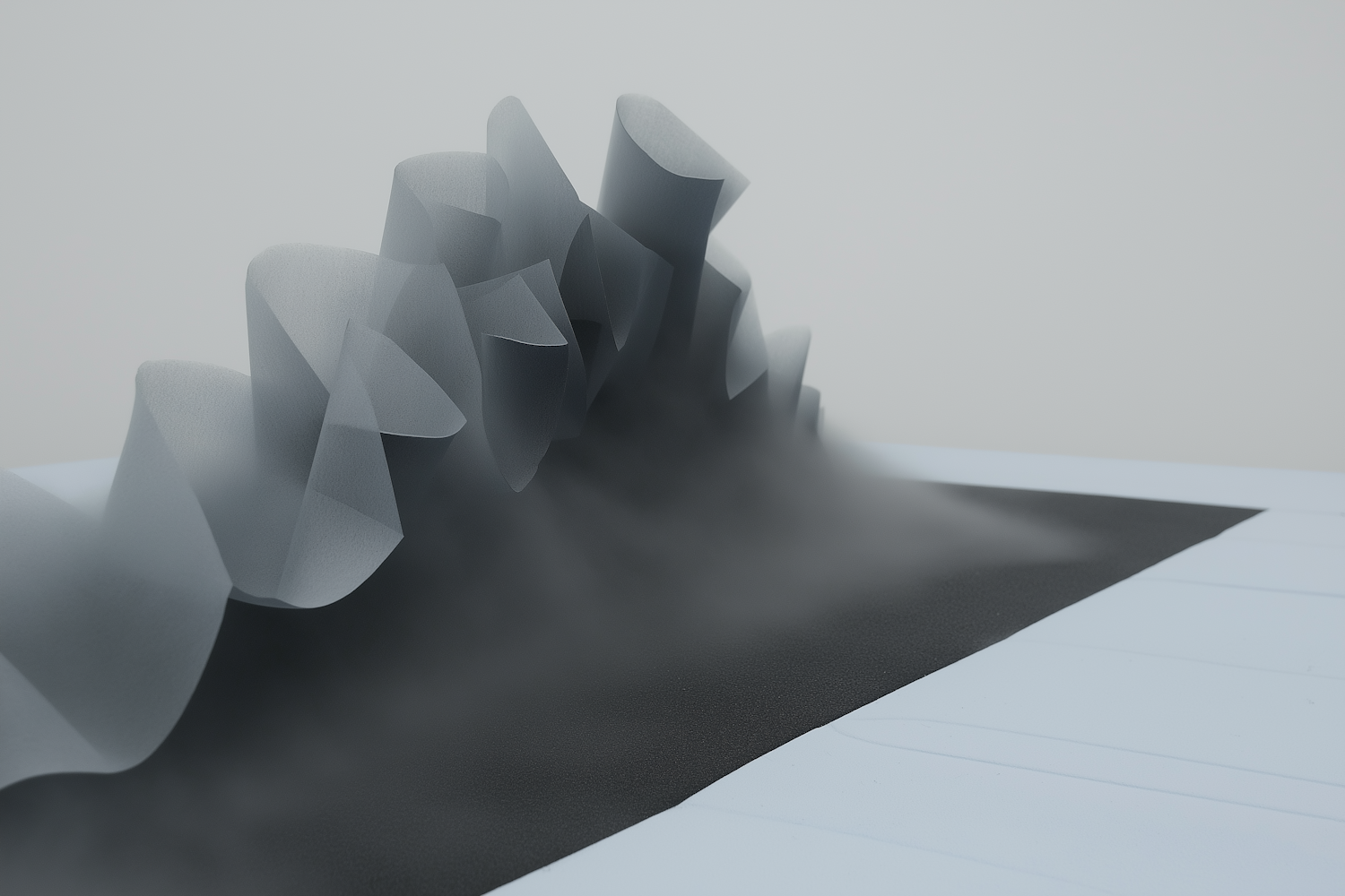 Abstract translucent wave-like structures rise from a dark surface, surrounded by mist, in a minimalist and surreal composition.