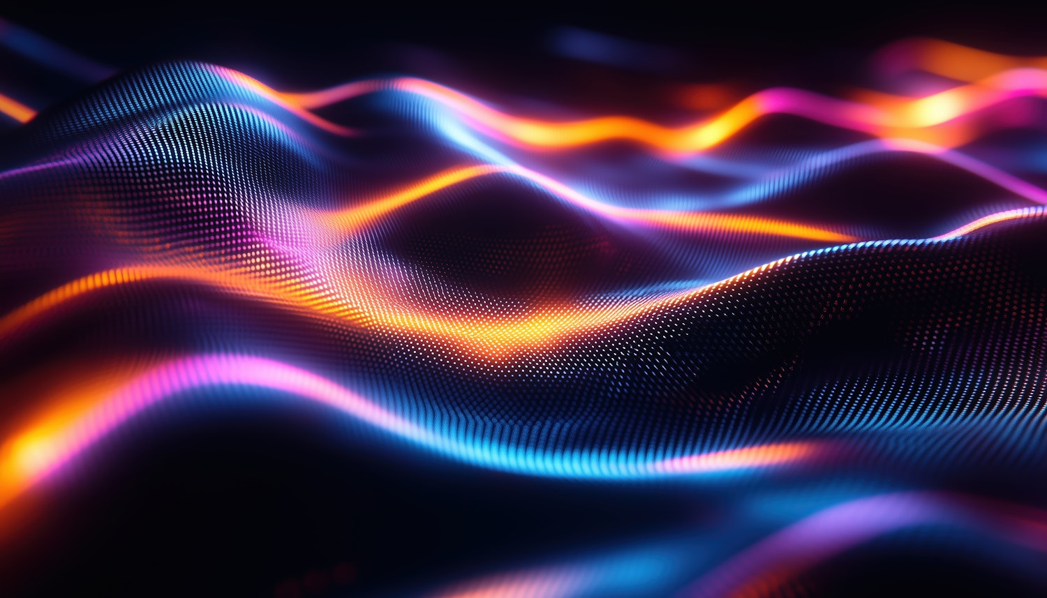 Vibrant digital waves of orange, pink, and blue ripple across a dark background, creating a dynamic and abstract visual pattern.