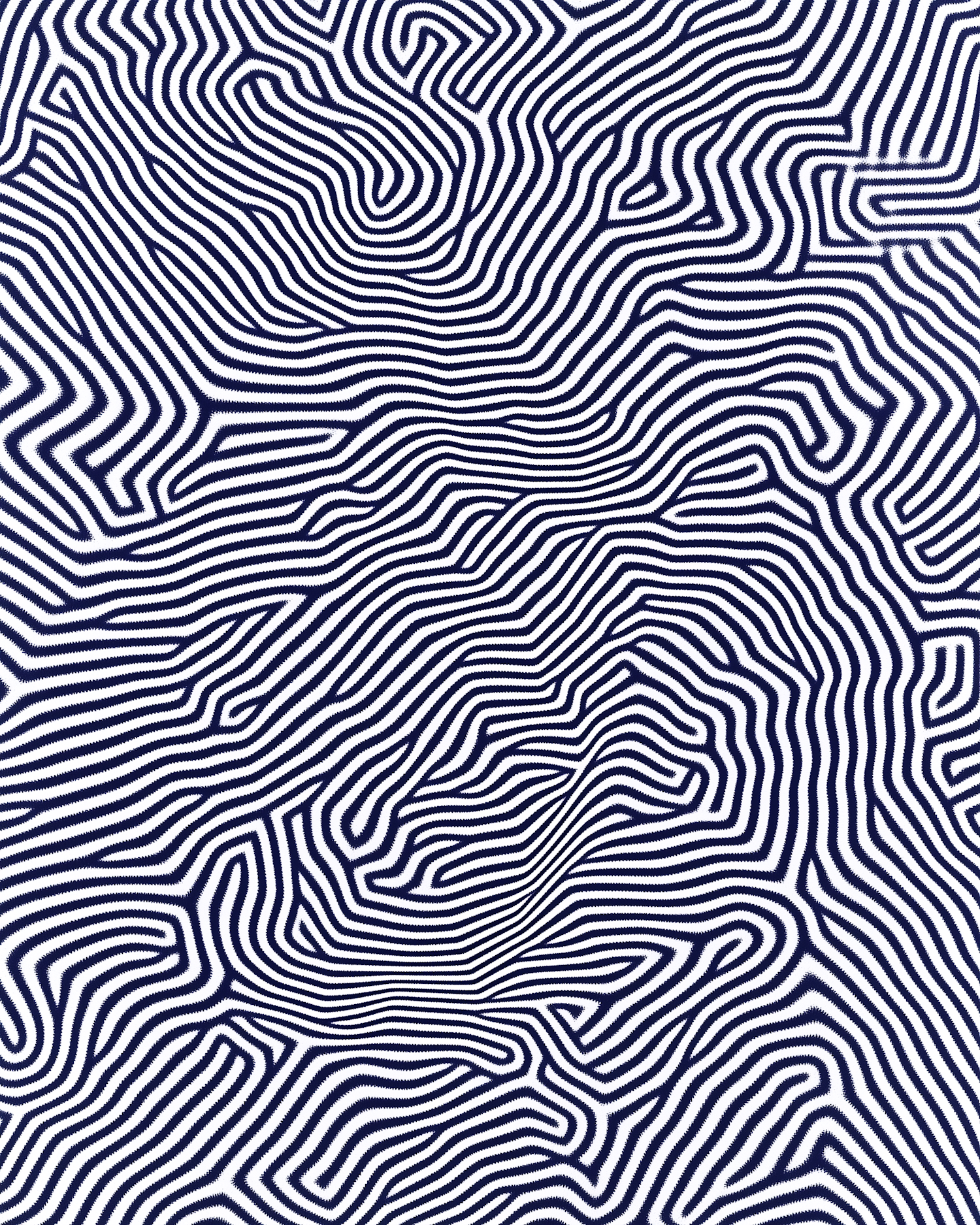 Hypnotic black and white wavy line pattern creating an optical illusion effect with intricate, maze-like paths.