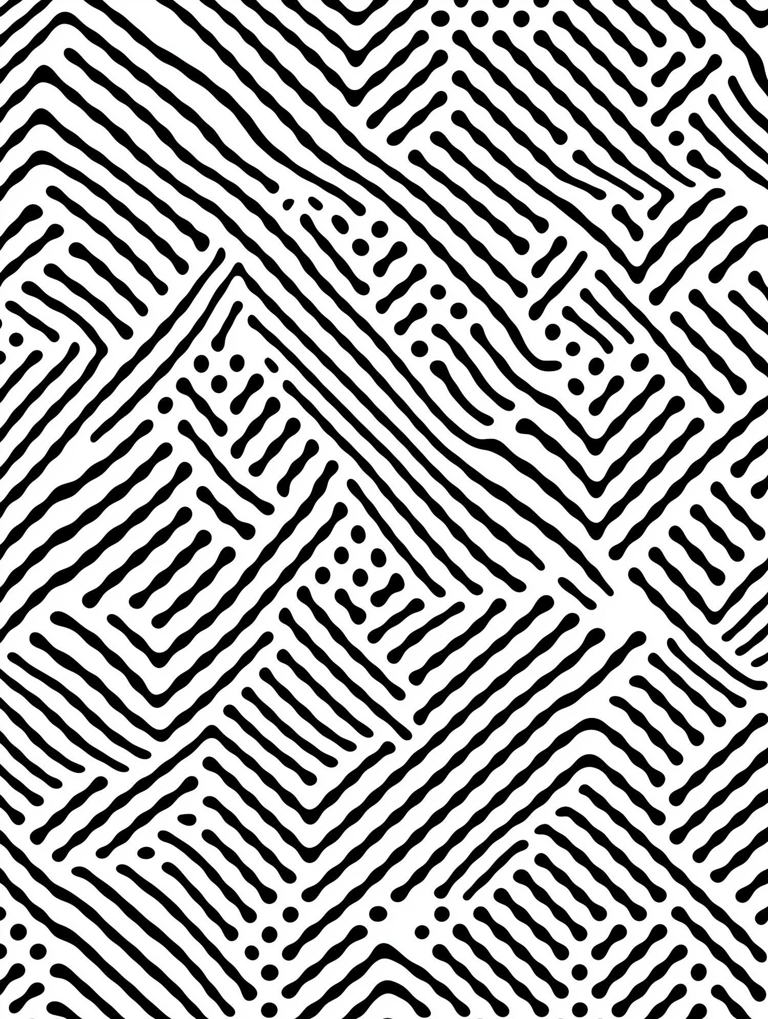 Bold black-and-white abstract pattern with wavy lines and dots in a zigzag grid. Perfect for modern design or artistic backgrounds.