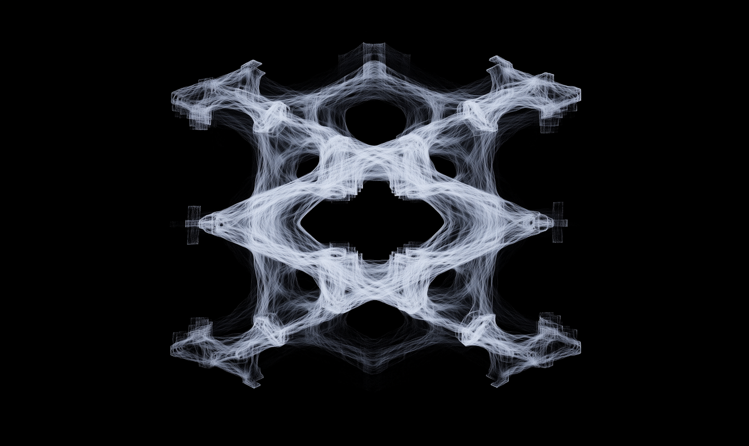 Symmetrical abstract white web-like design on a black background, featuring intricate, mirrored patterns and a star-like central shape.